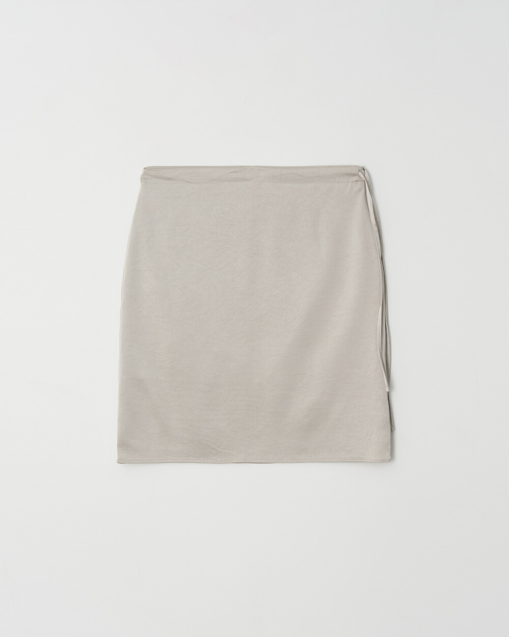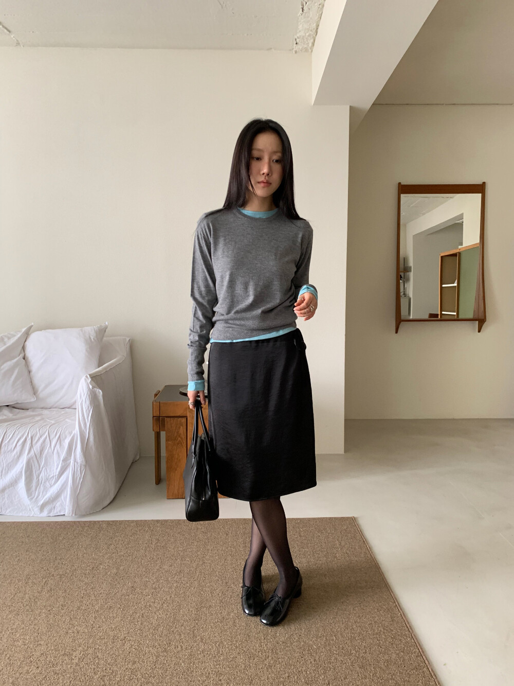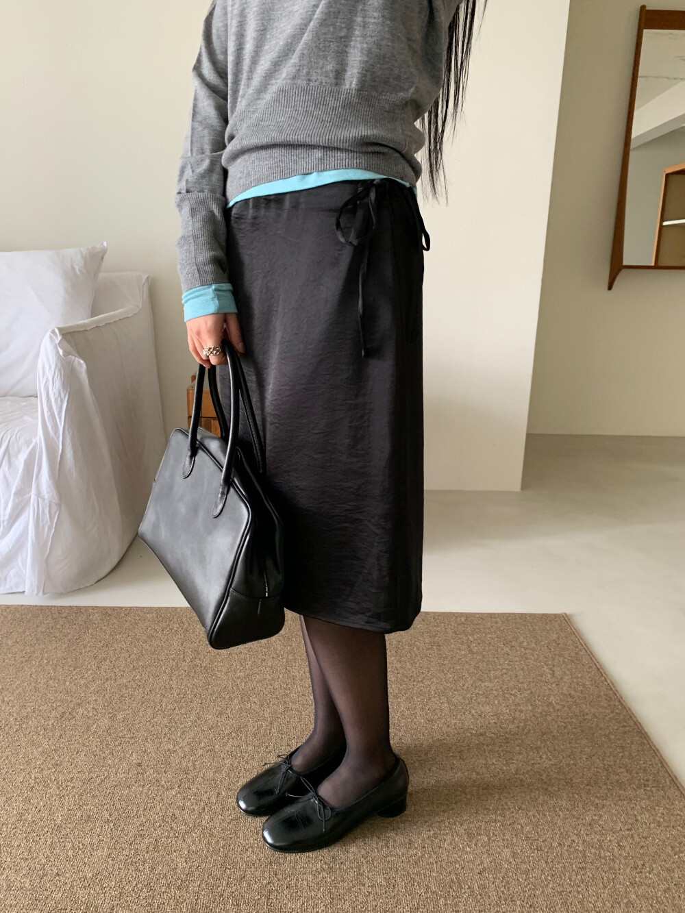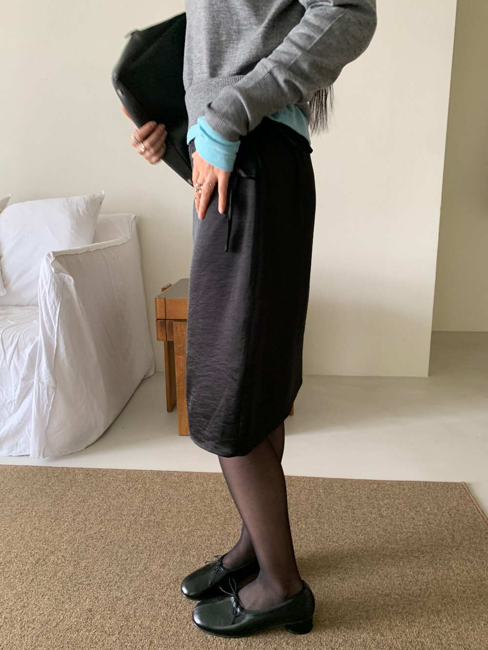 은은한 광택이 느껴지는 샤틴 소재로 제작된 미디 스커트입니다.