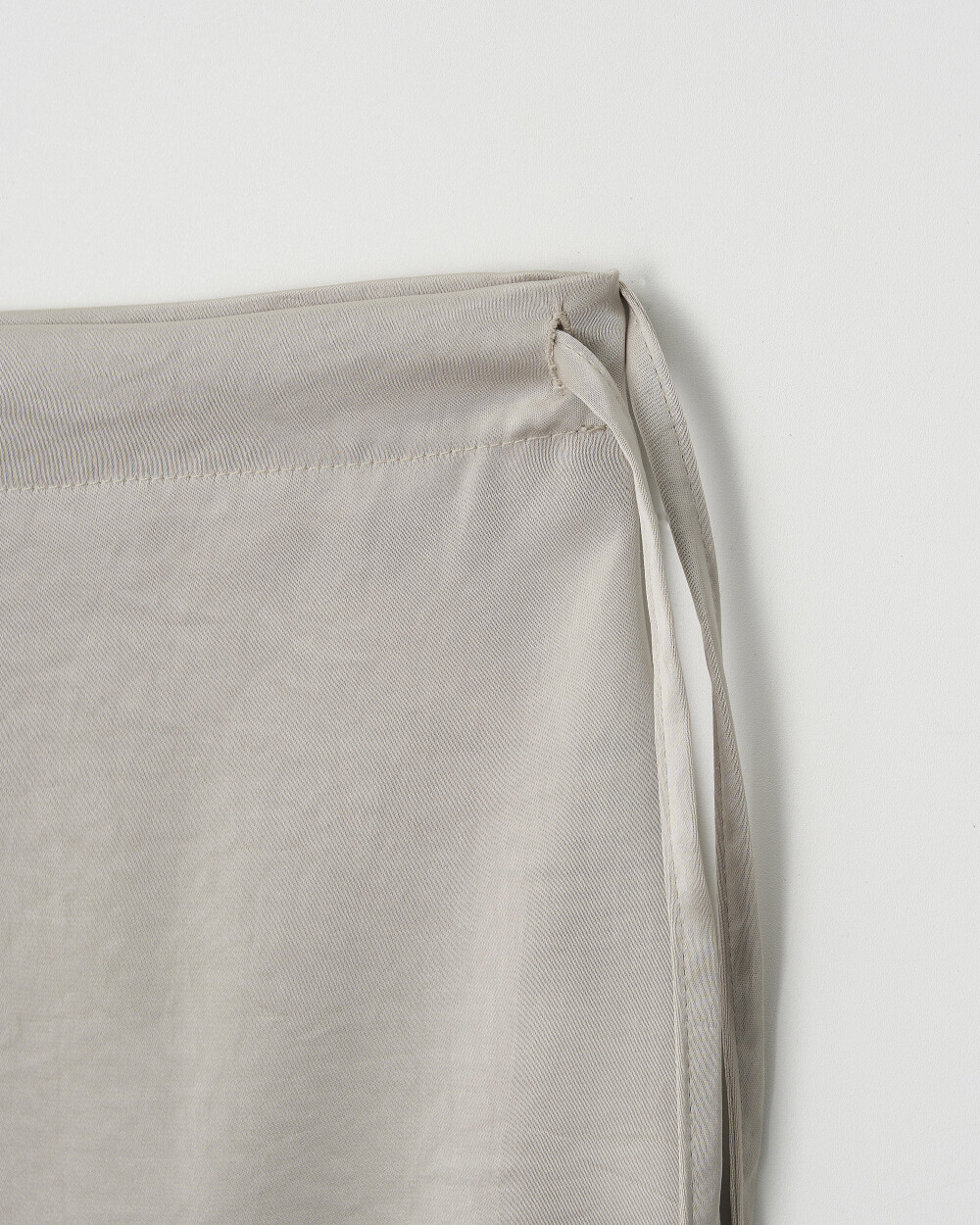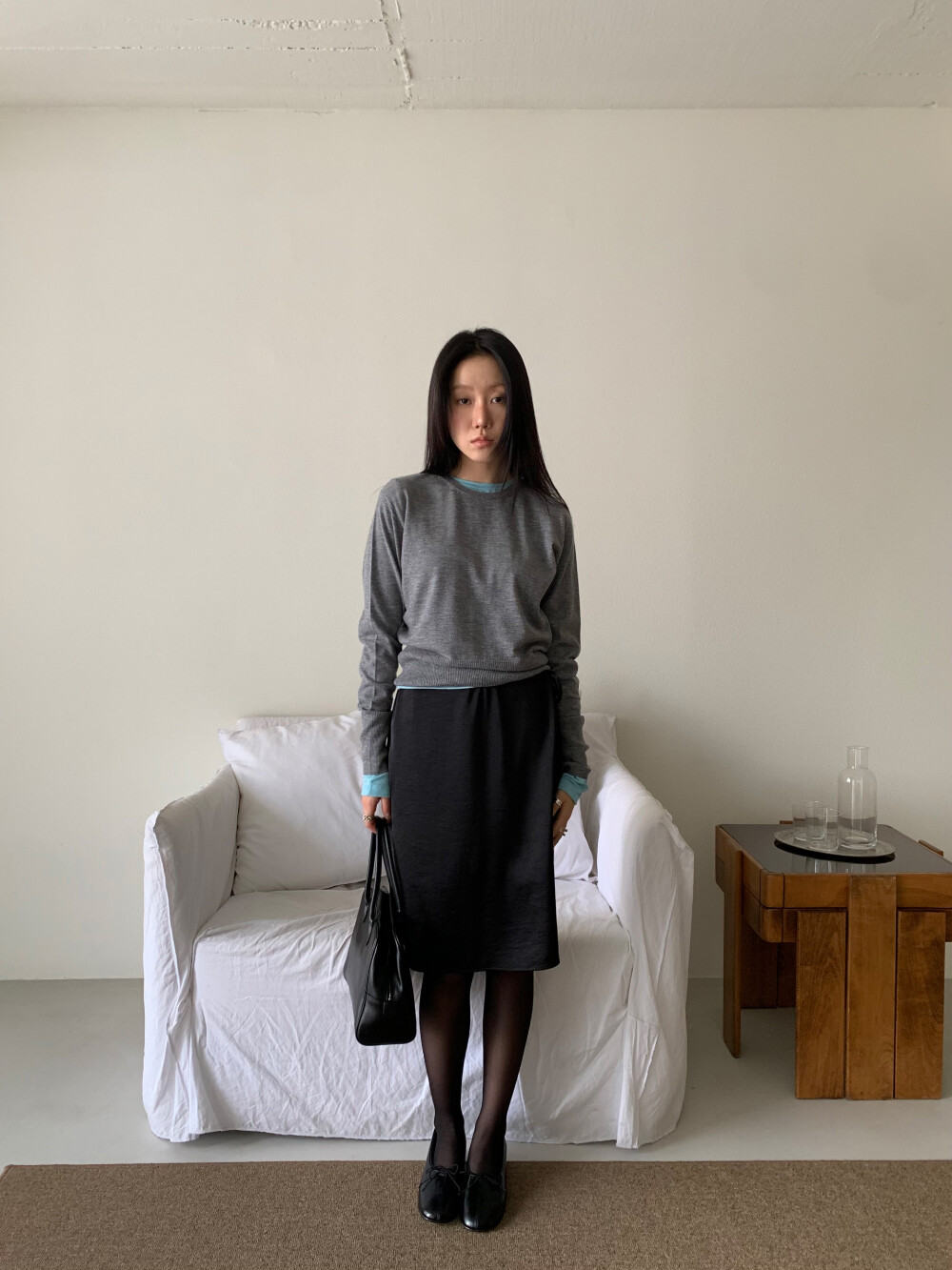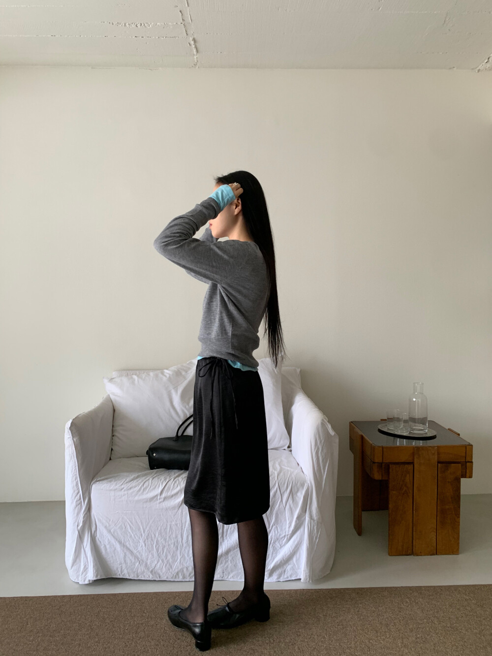 은은한 광택이 느껴지는 샤틴 소재로 제작된 미디 스커트입니다.