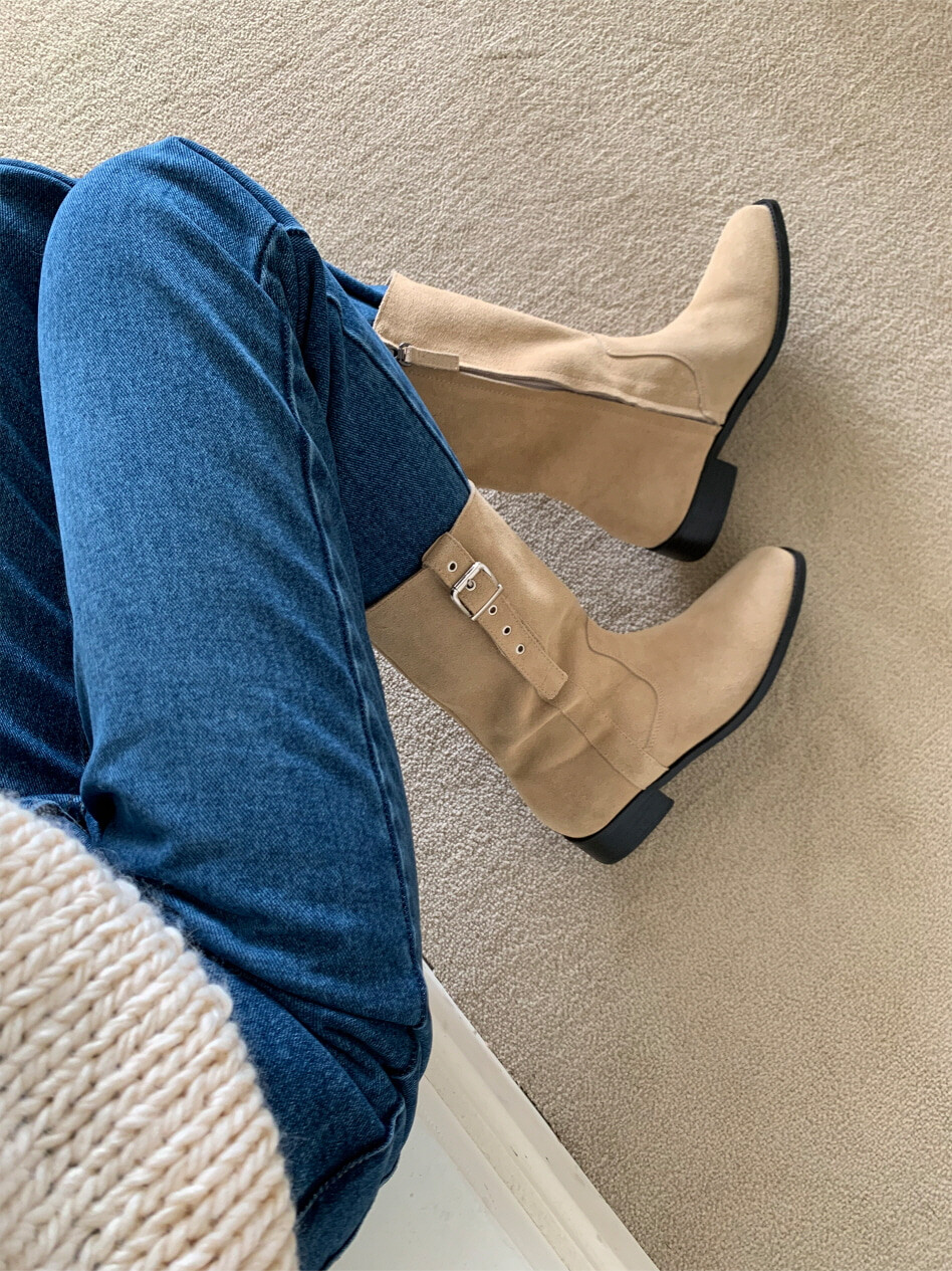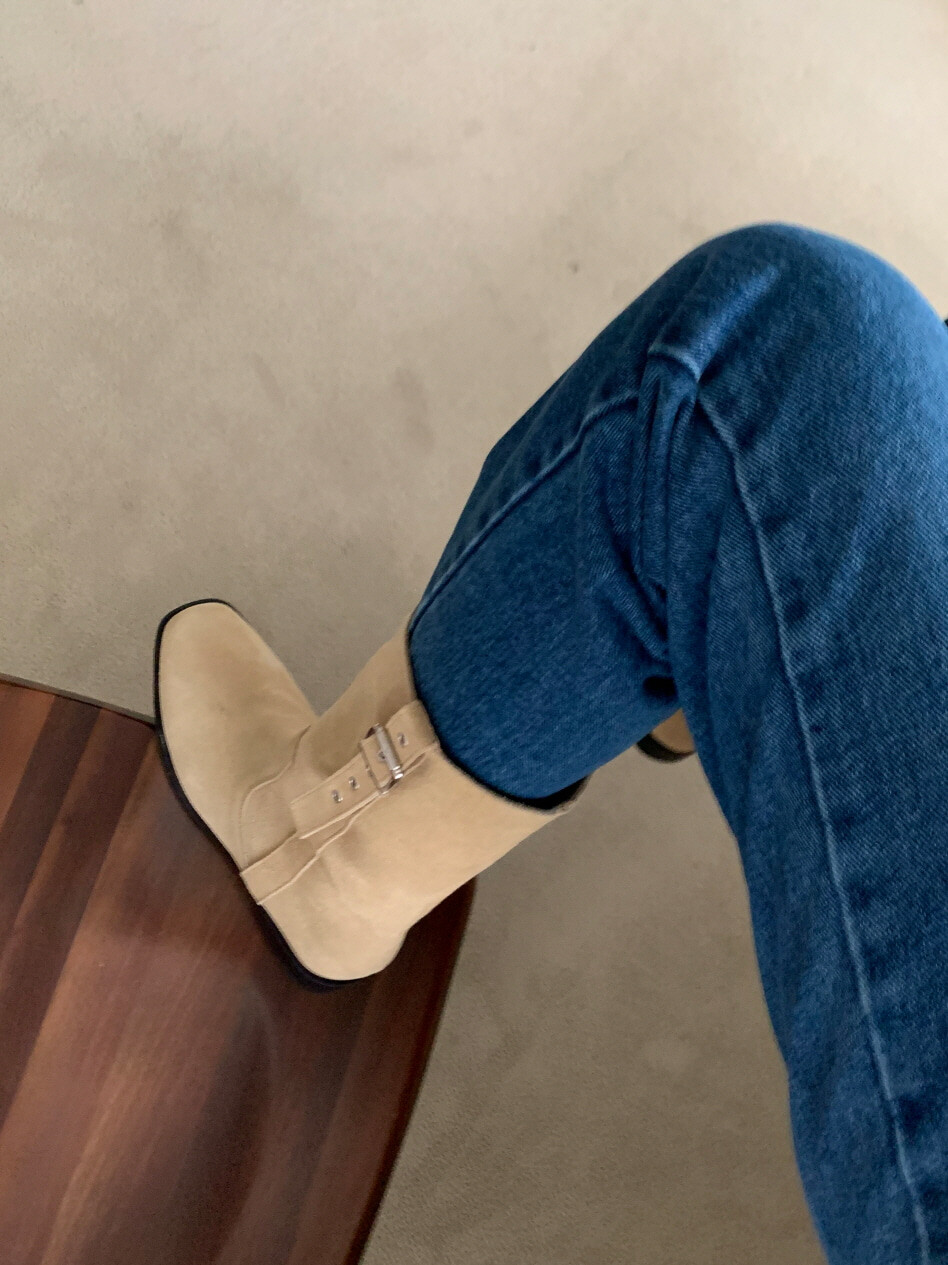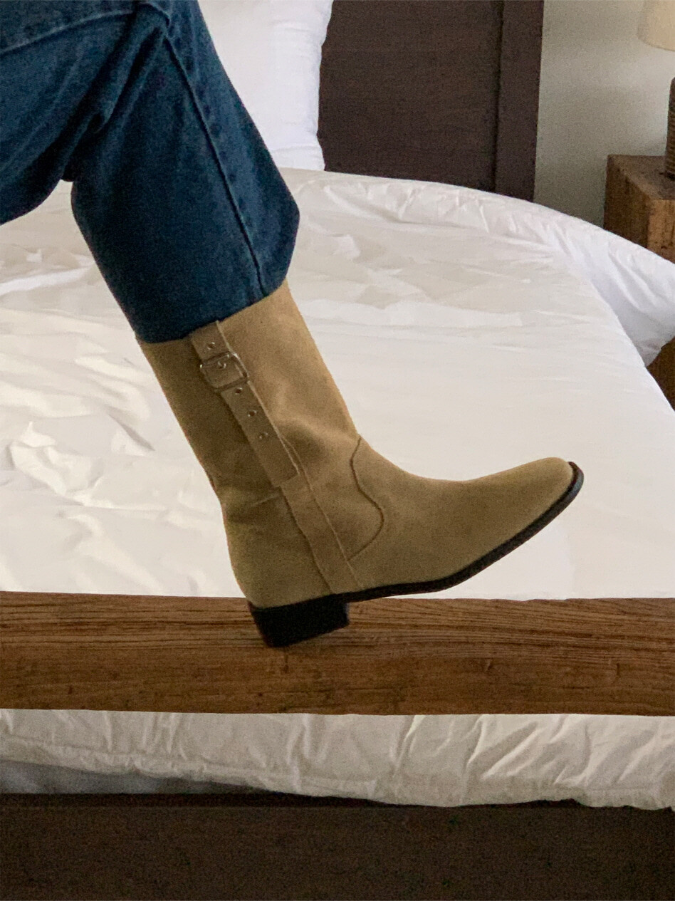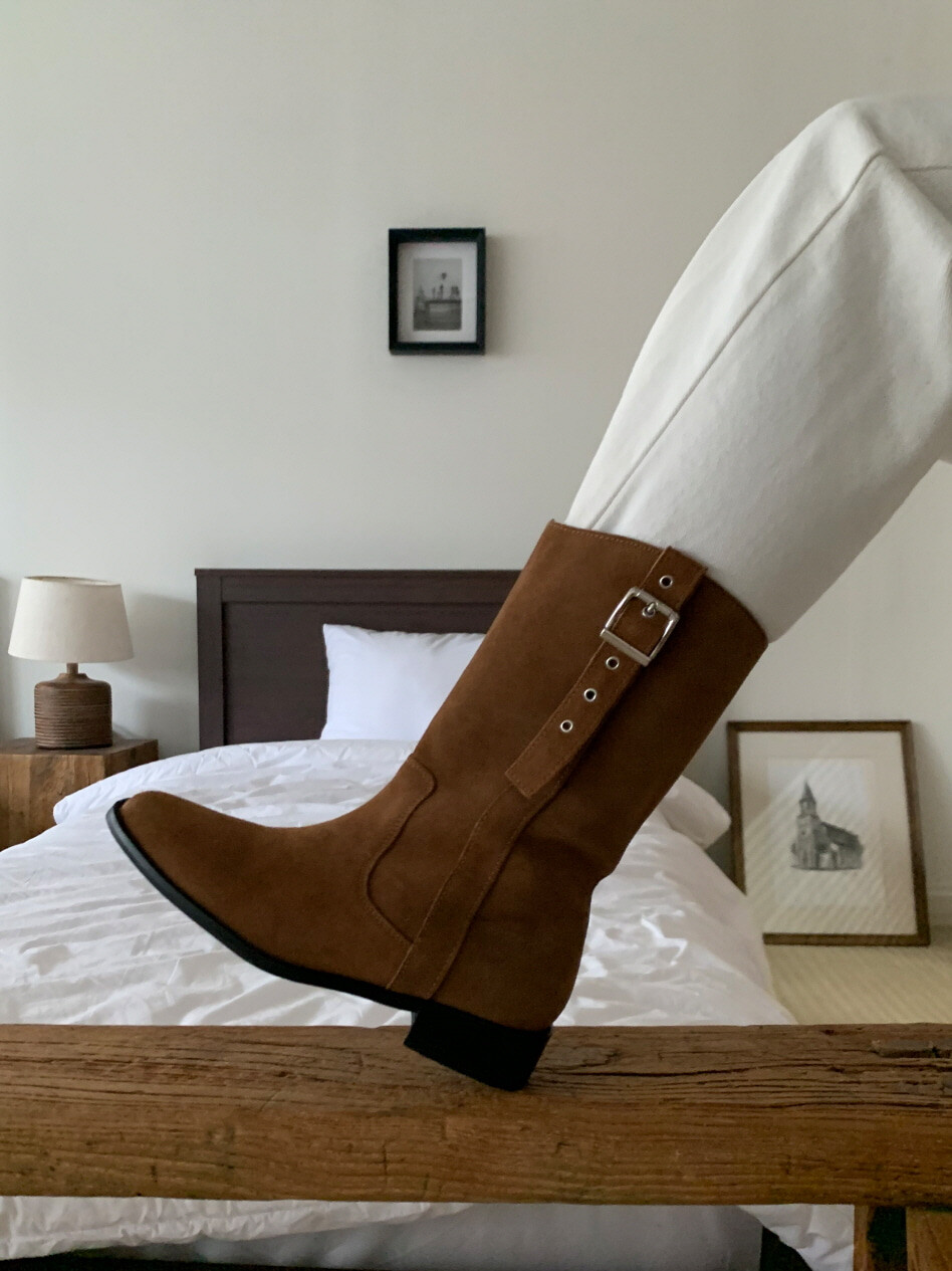 고급스러운 스웨이드와 레더 소재로 제작되어 부드럽고 자연스러운 텍스처를 자랑하며, 발목 위까지 올라오는 안정적인 기장감이 세련된 실루엣을 연출합니다. 측면 버클 디테일로 웨스턴 무드의 포인트를 더했으며, 사이드 지퍼로 손쉽게 착용할 수 있어 실용성을 높였습니다.