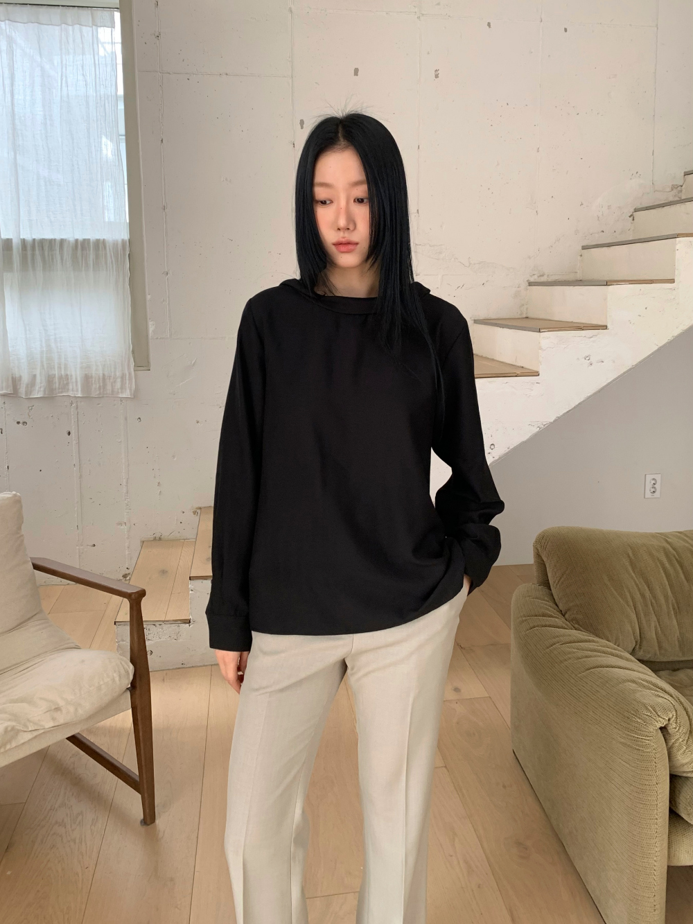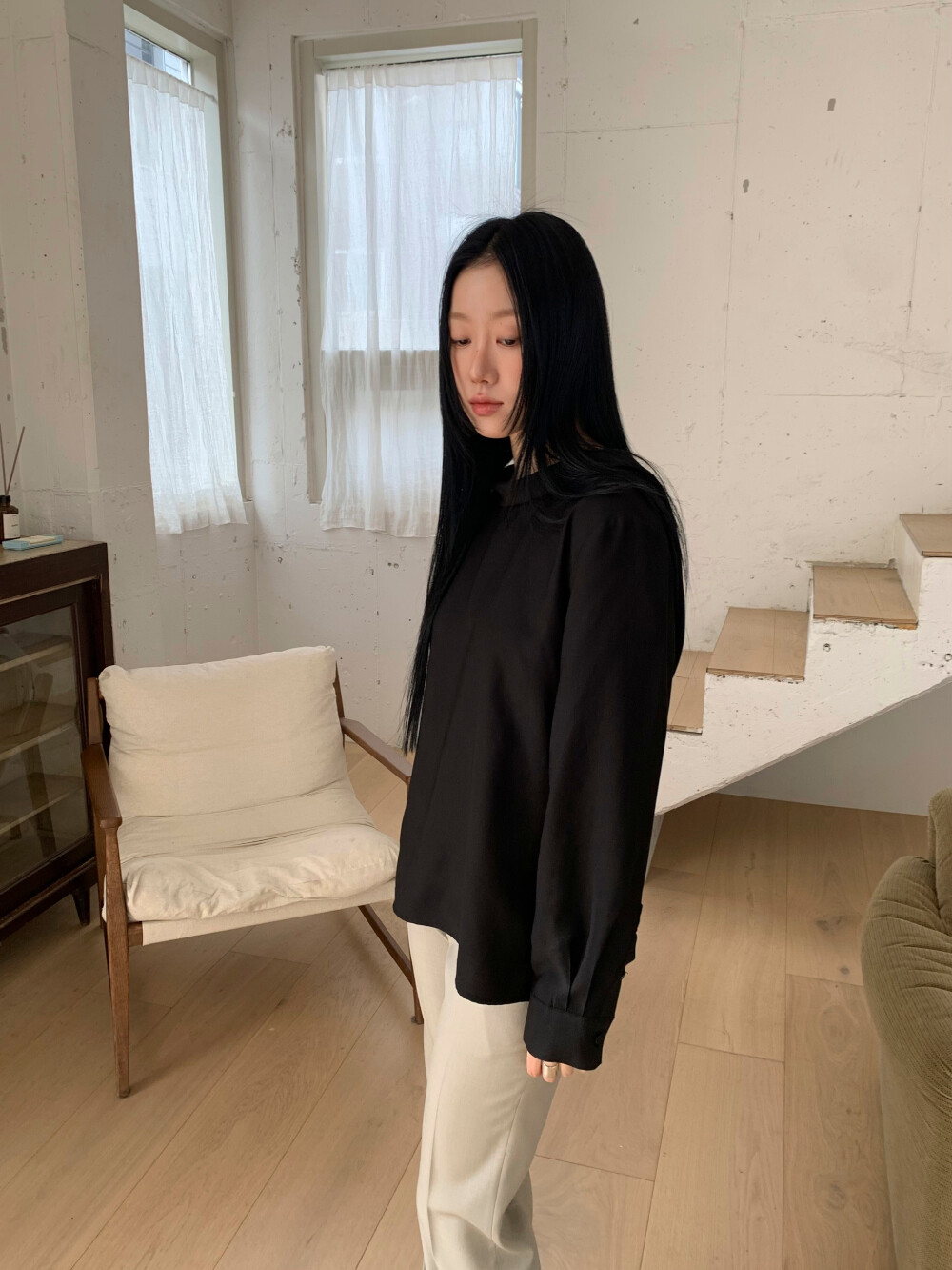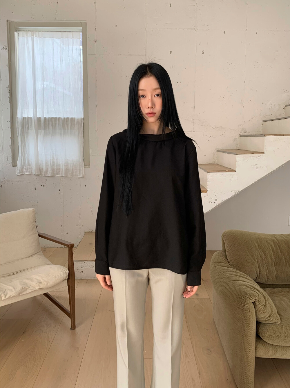 심플한 앞모습과 대비되는 백 디테일이 매력적인 블라우스입니다.