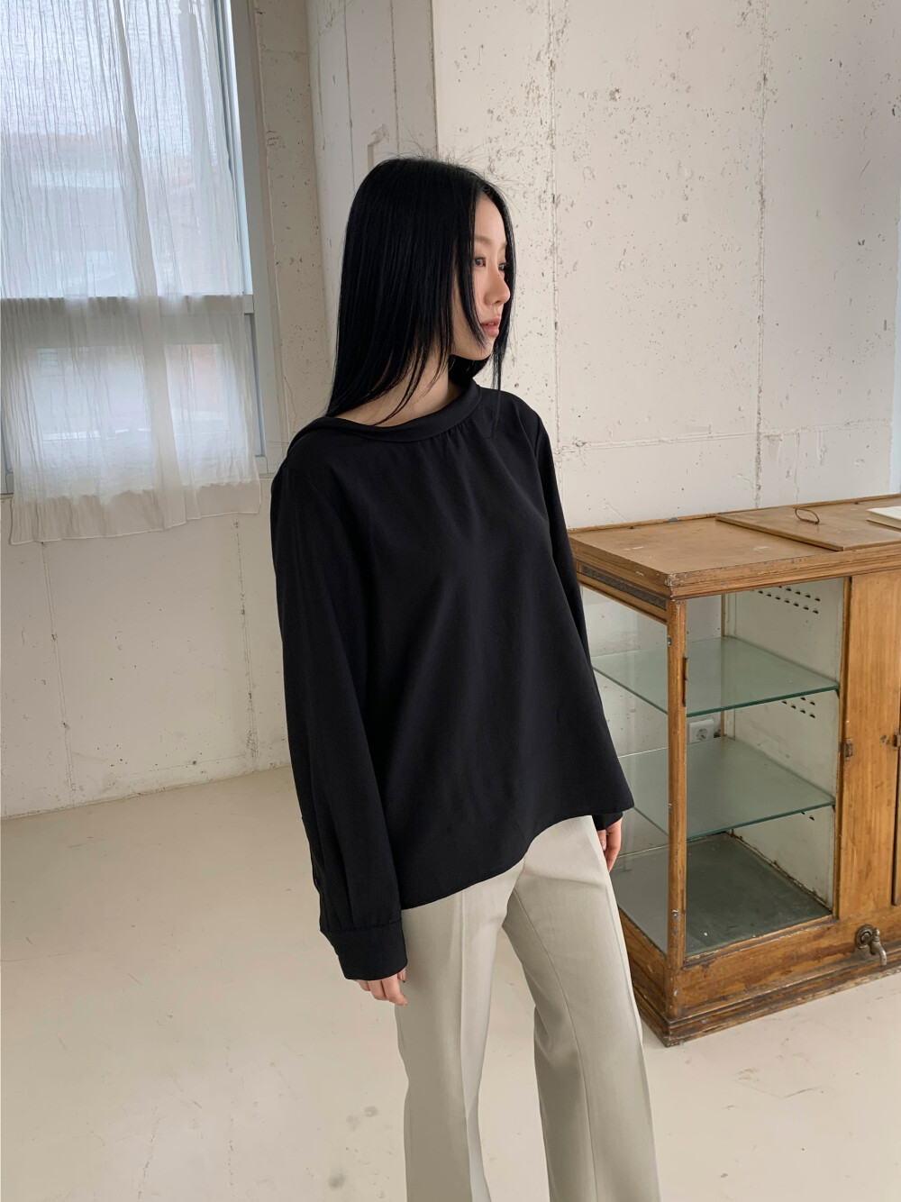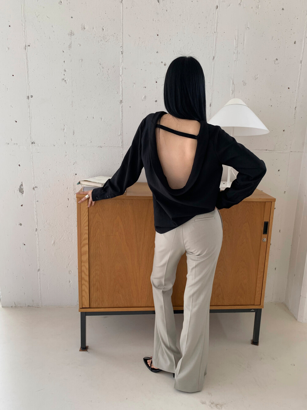 뒷모습이 포인트가 되는 백트임 블라우스입니다.