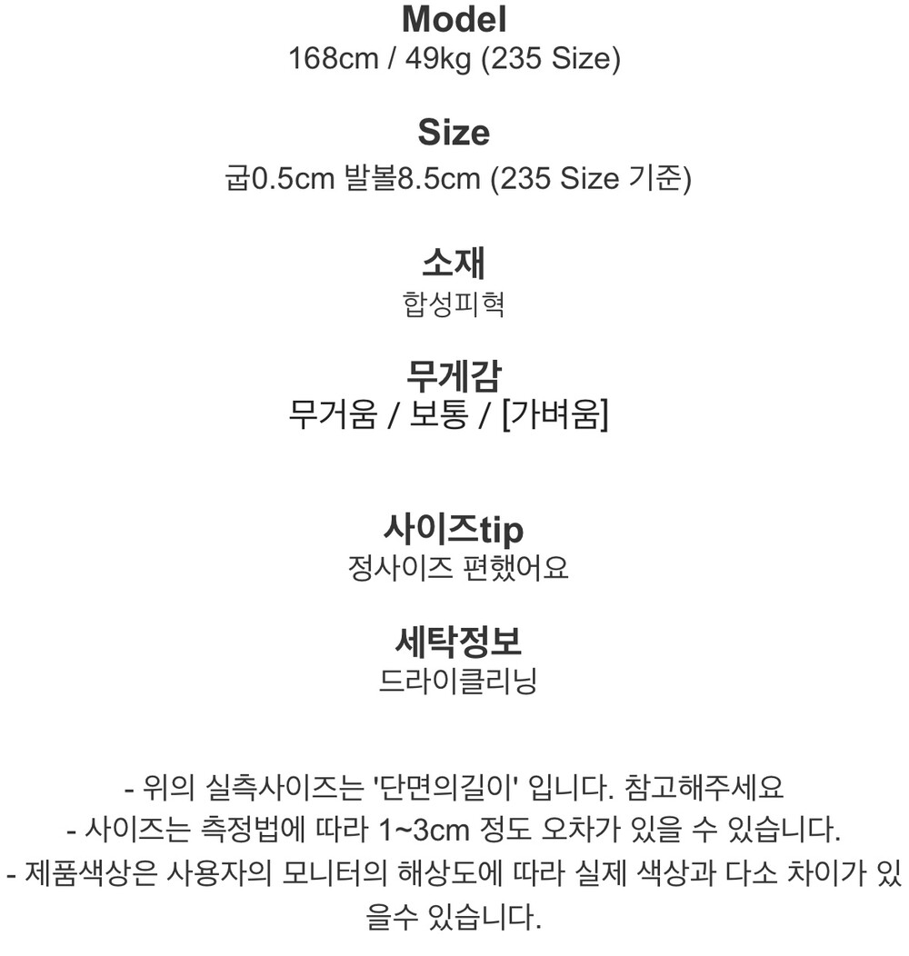 발볼에 따라 한사이즈 업 추천드립니다.
