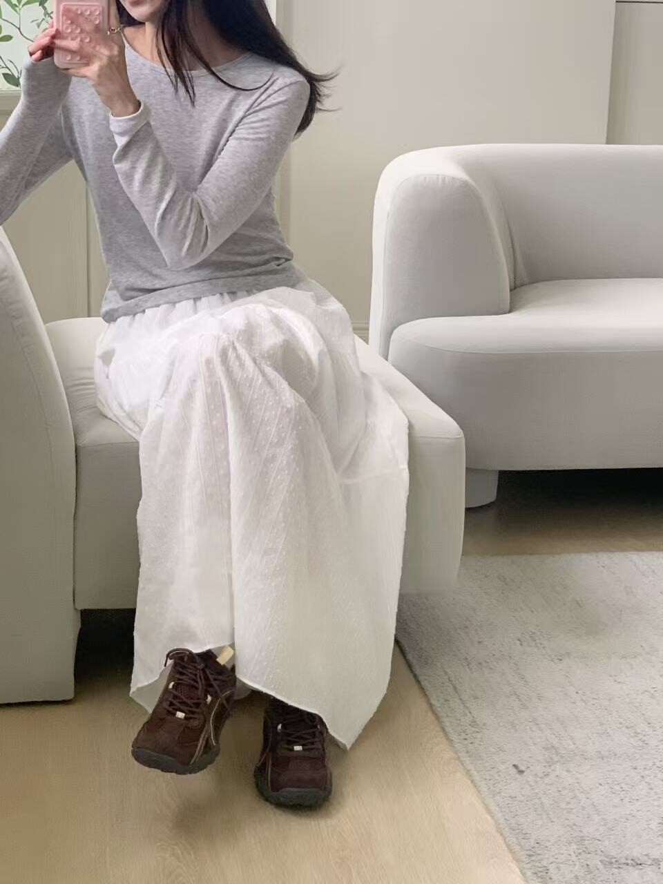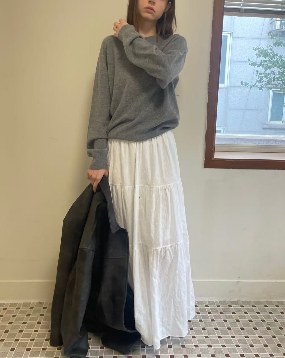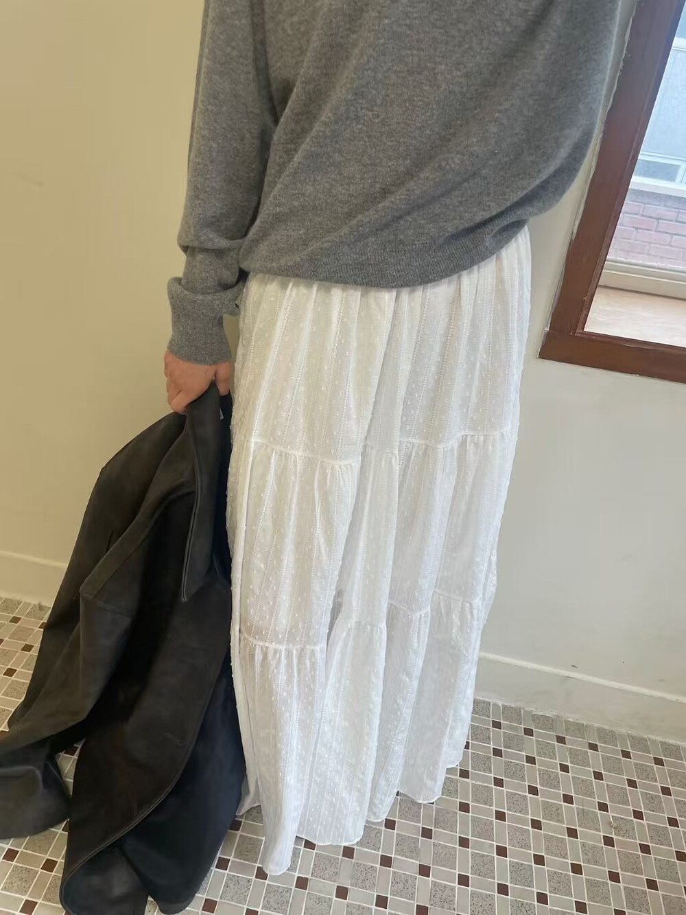 가볍고 은은하게 포인트가 되는 도트 펀칭 원단으로 제작된 3단 캉캉 롱 스커트예요.아이보리 컬러 특유의 깨끗하고 포근한 분위기 덕분에 단독으로도, 다양한 상의와도 조화롭게 어우러져요.