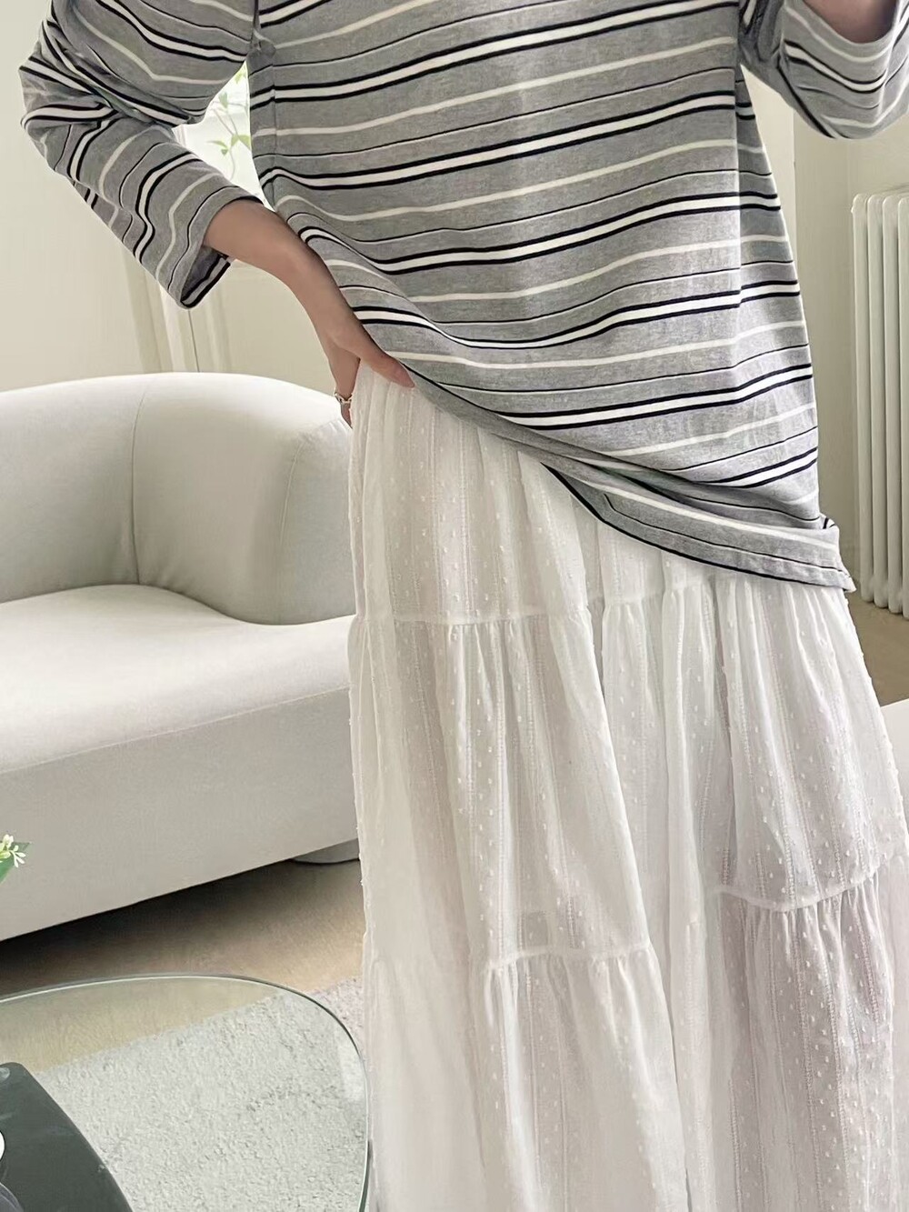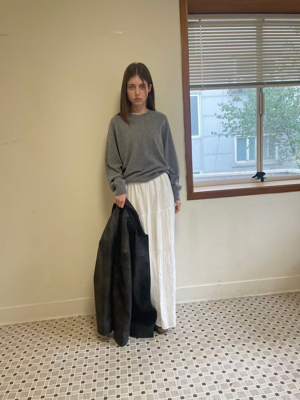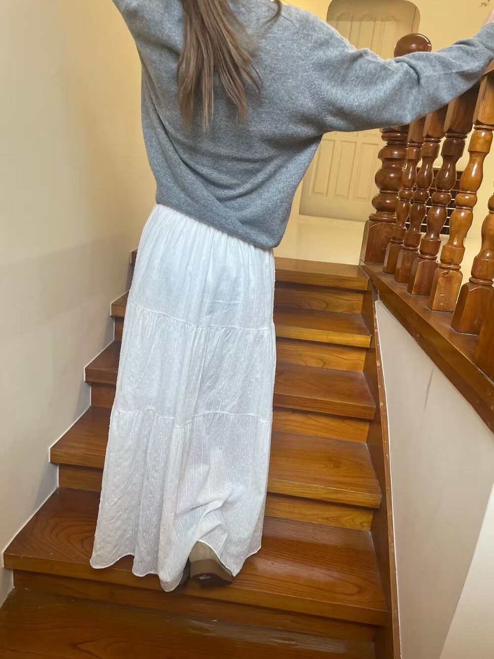 가볍고 은은하게 포인트가 되는 도트 펀칭 원단으로 제작된 3단 캉캉 롱 스커트예요.아이보리 컬러 특유의 깨끗하고 포근한 분위기 덕분에 단독으로도, 다양한 상의와도 조화롭게 어우러져요.