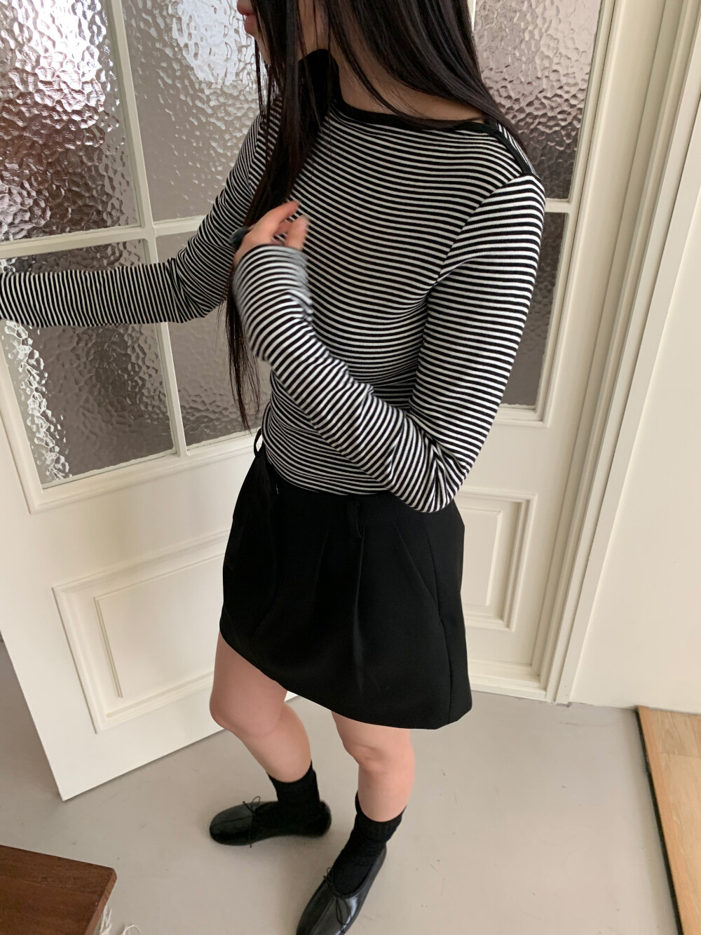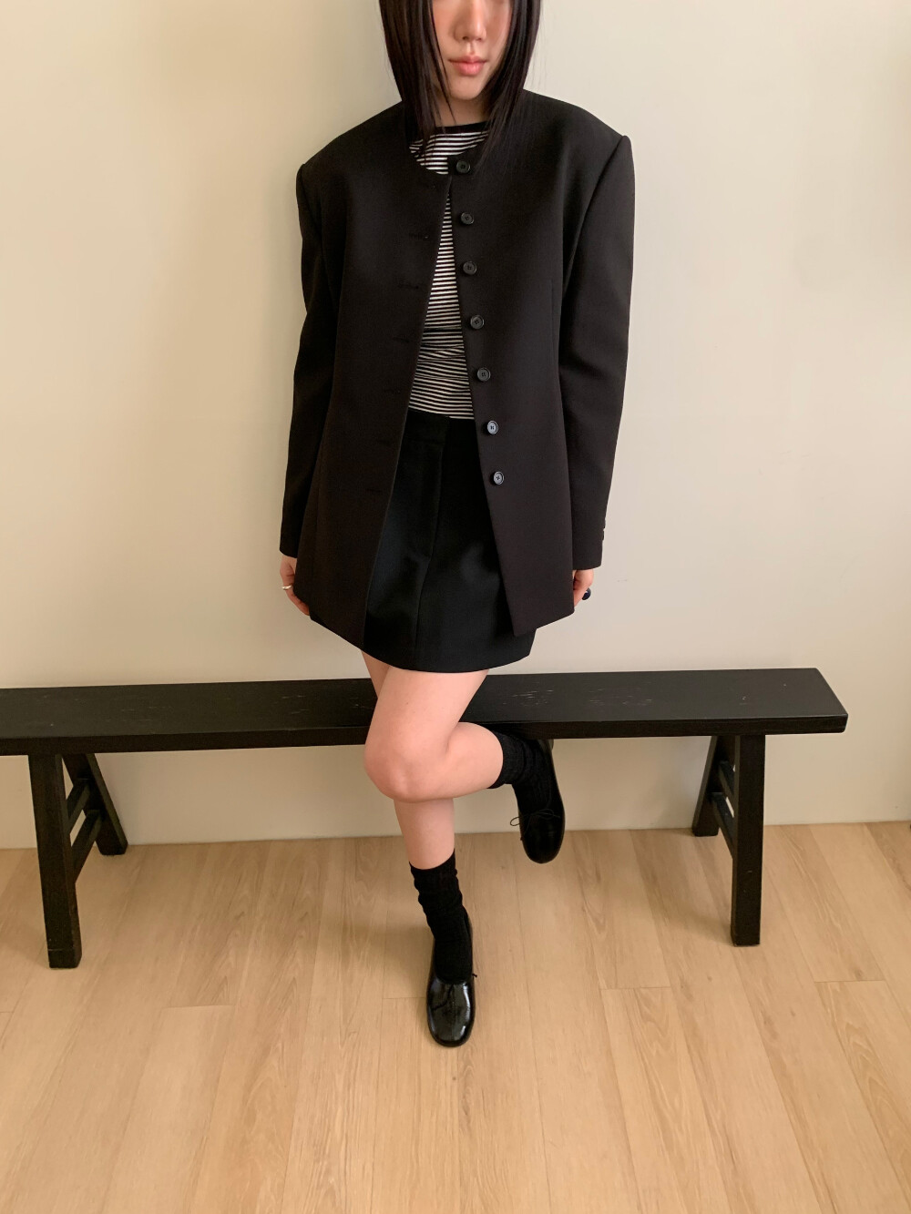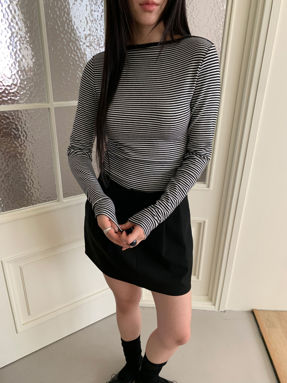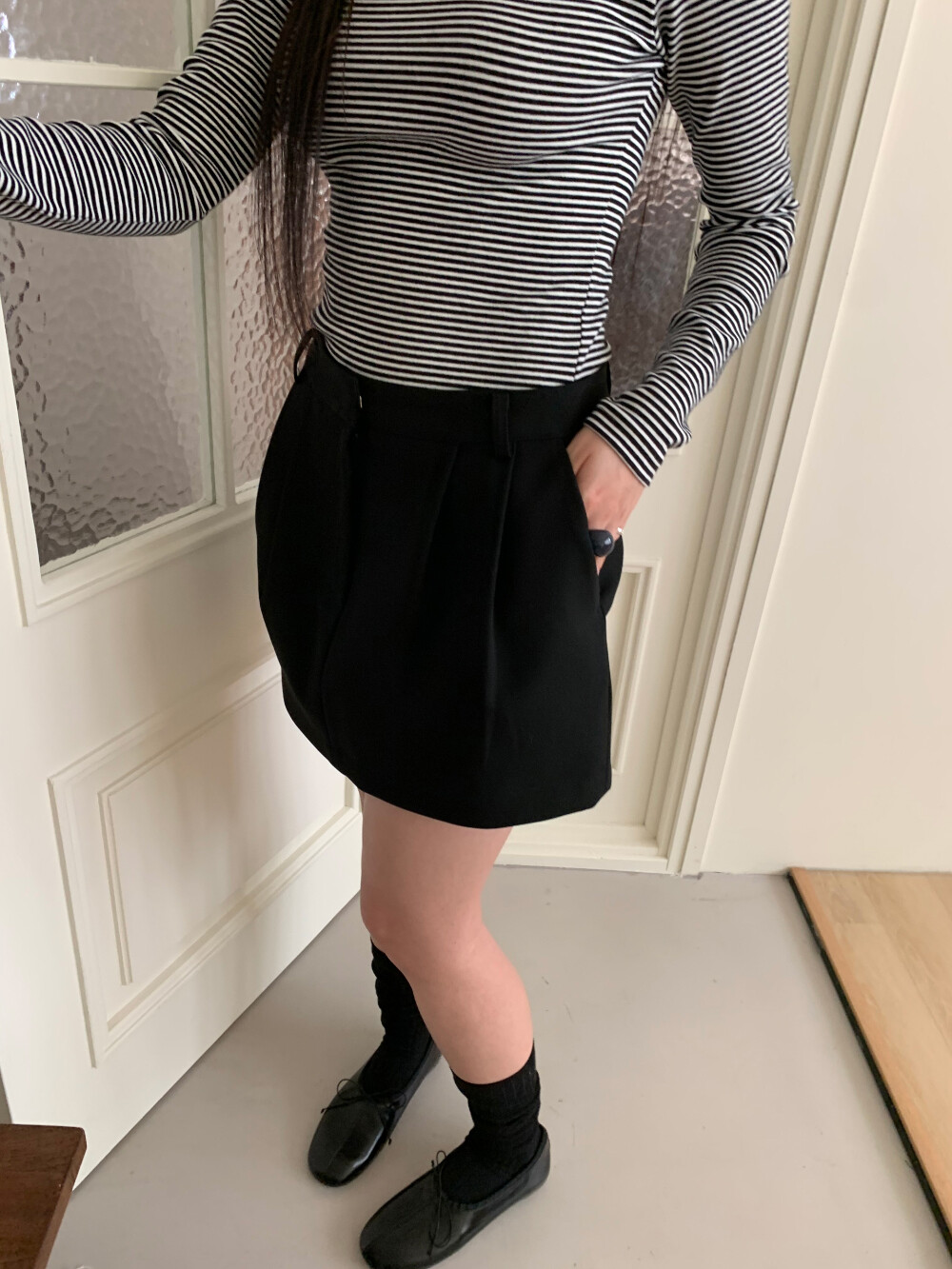미니 기장이지만 부담스럽지 않은 핏으로 데일리하게 즐겨입기 좋고