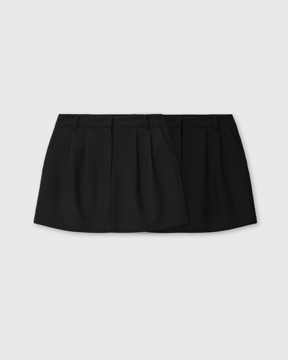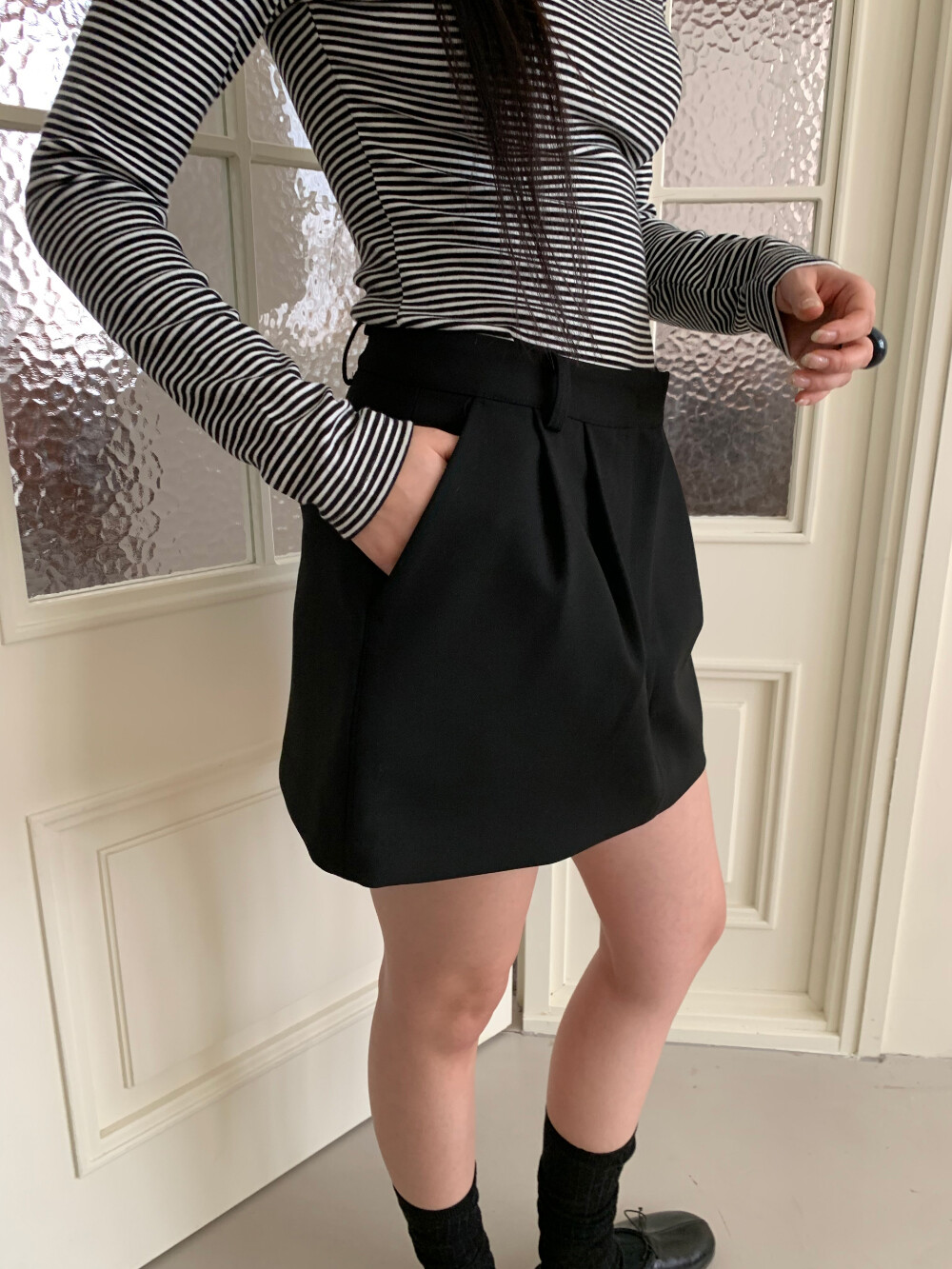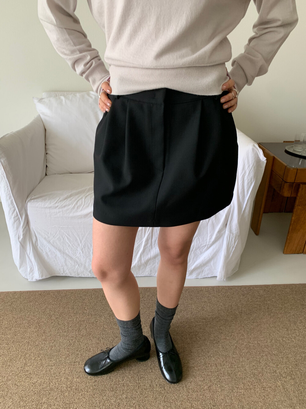 허리 부분에 턱 디테일이 잡혀 자연스럽게 볼륨감이 살아있는 미니 스커트입니다.