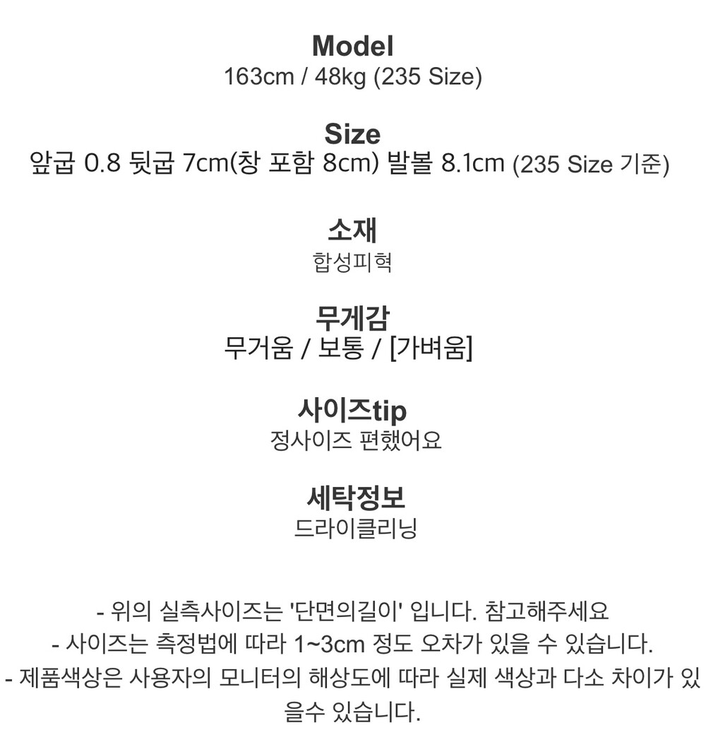 뒷굽:7.0(창포함8.0)/앞굽:0.8/볼8.1(cm)