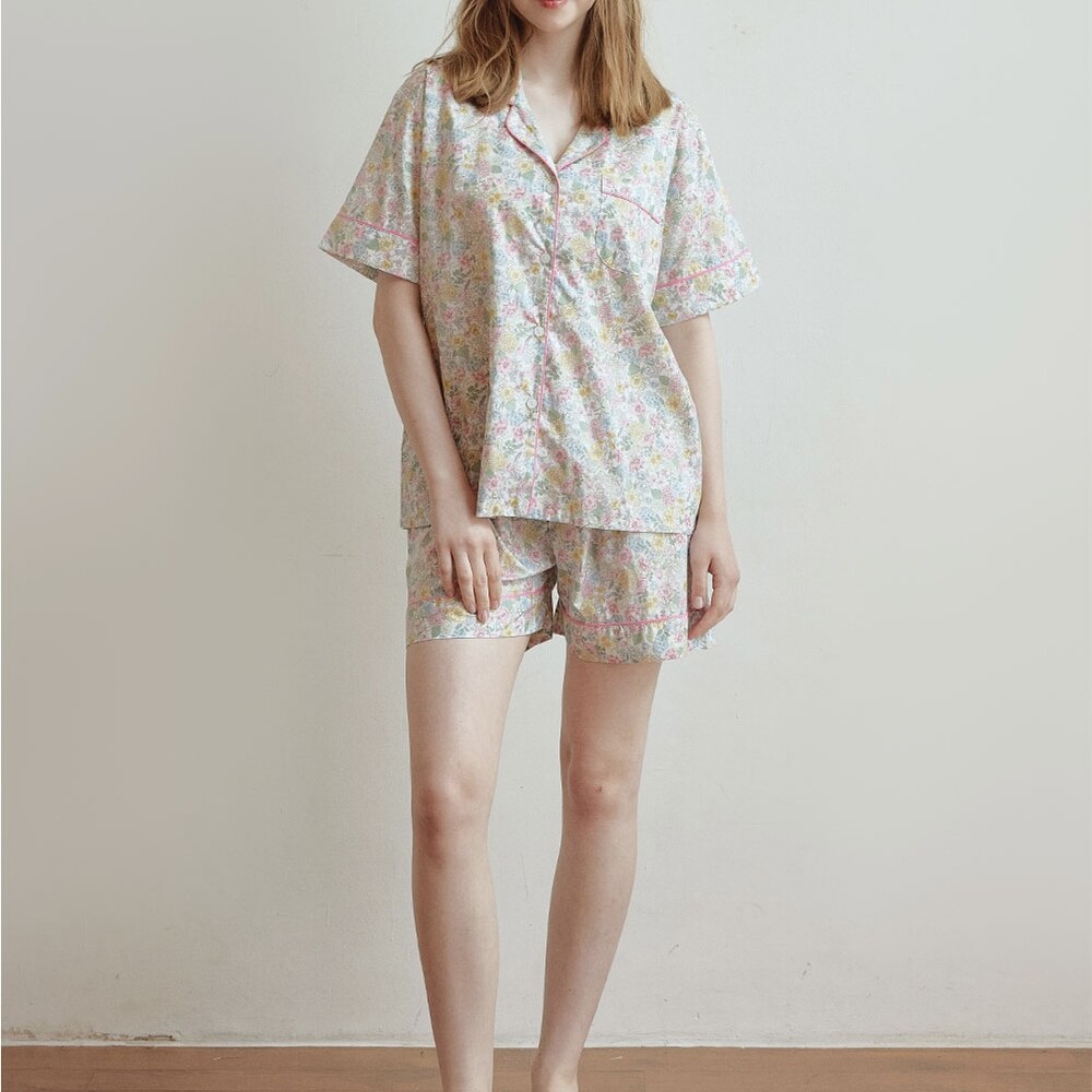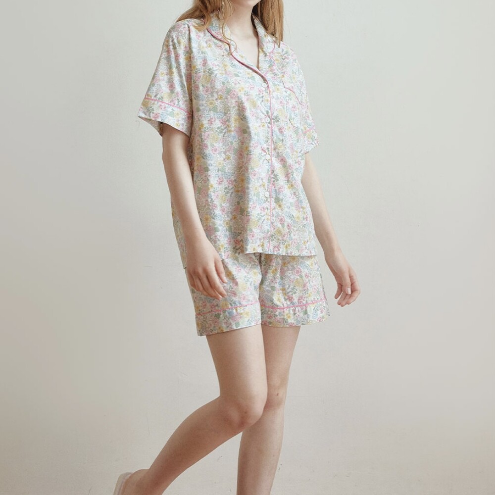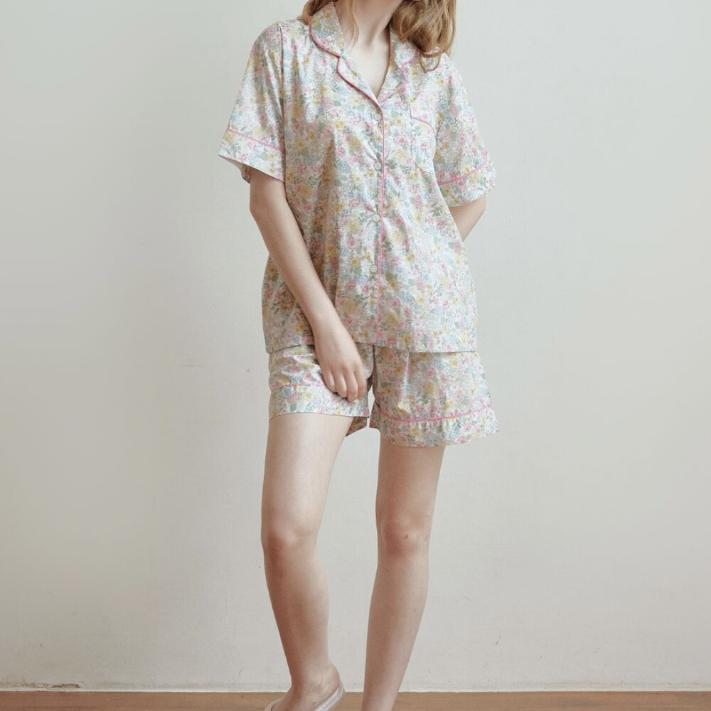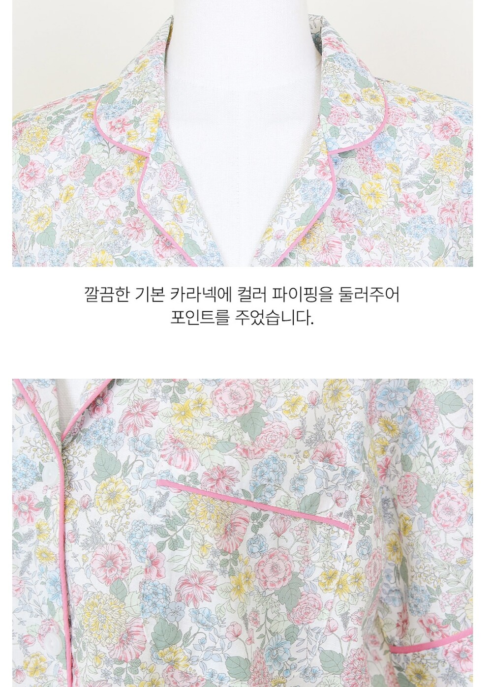 플로럴 모티브로 러블리하고 통통튀는 매력을 가진 파자마 세트입니다.