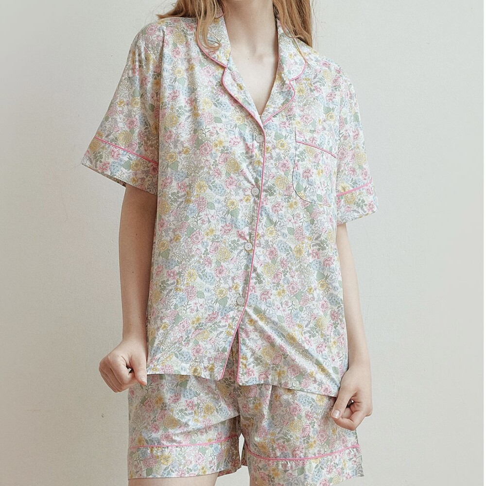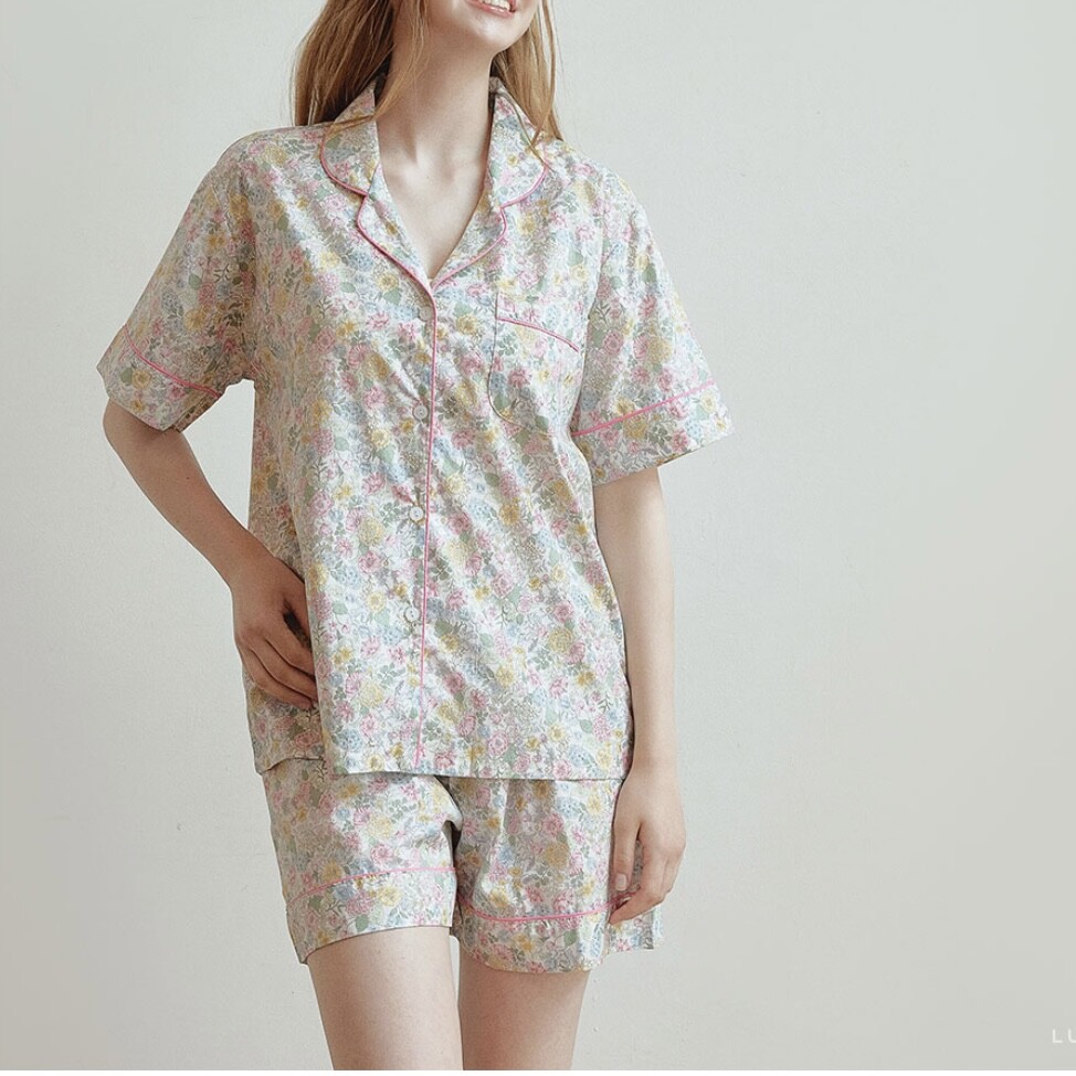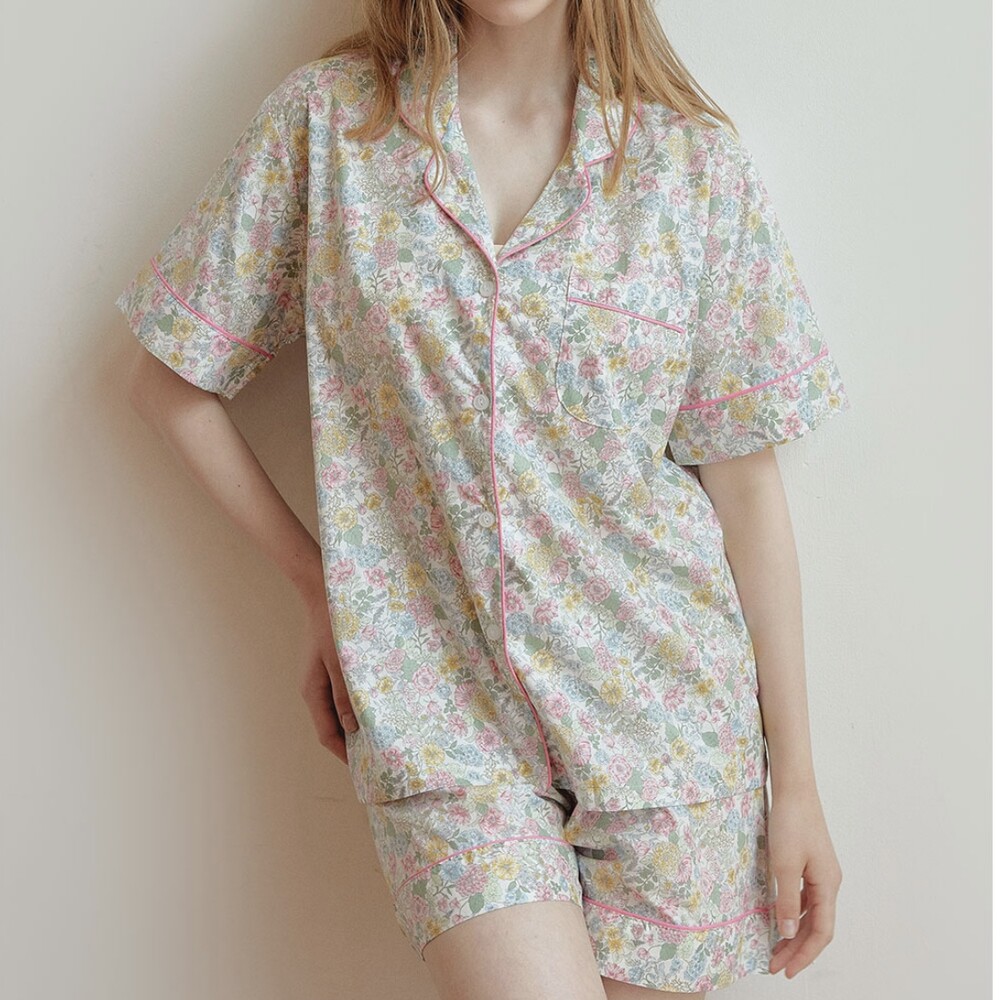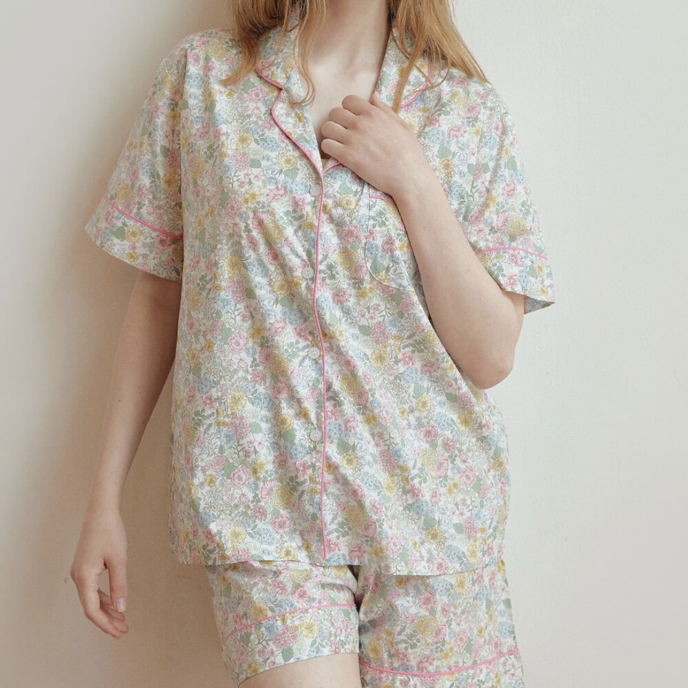 플로럴 모티브로 러블리하고 통통튀는 매력을 가진 파자마 세트입니다.