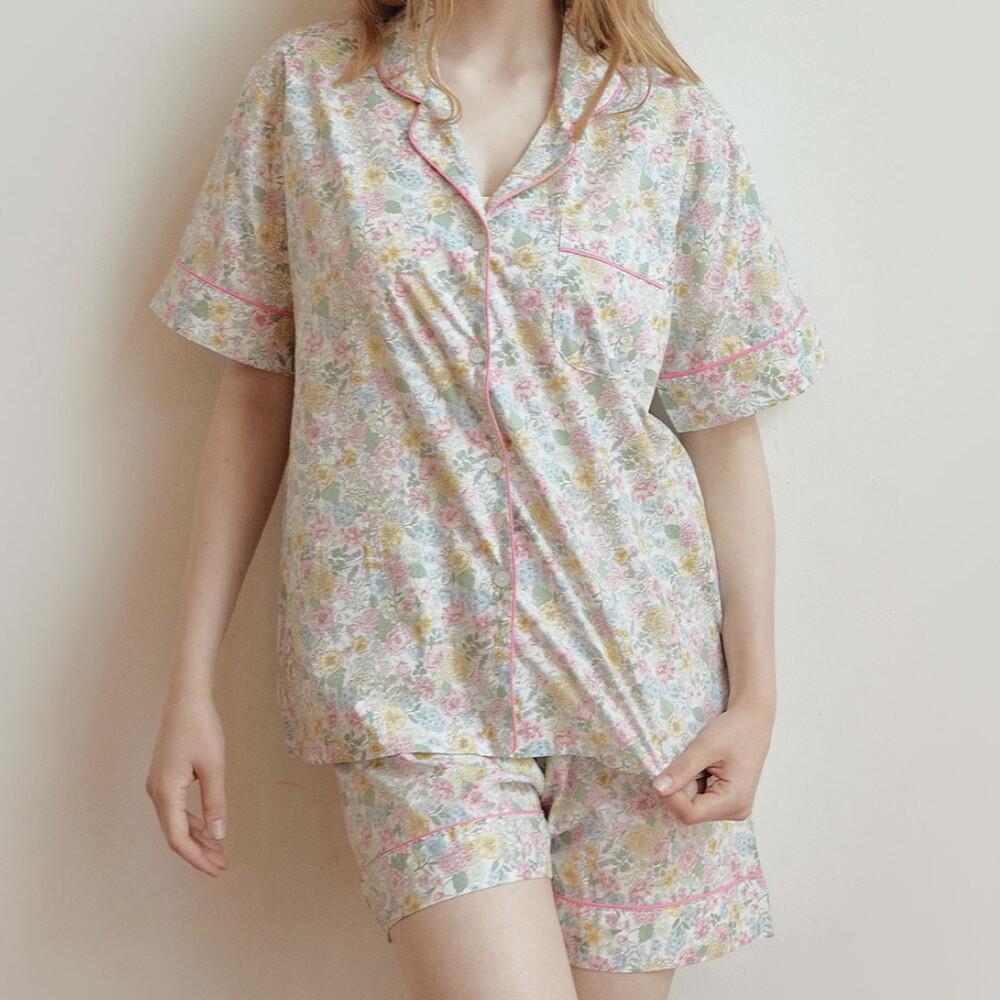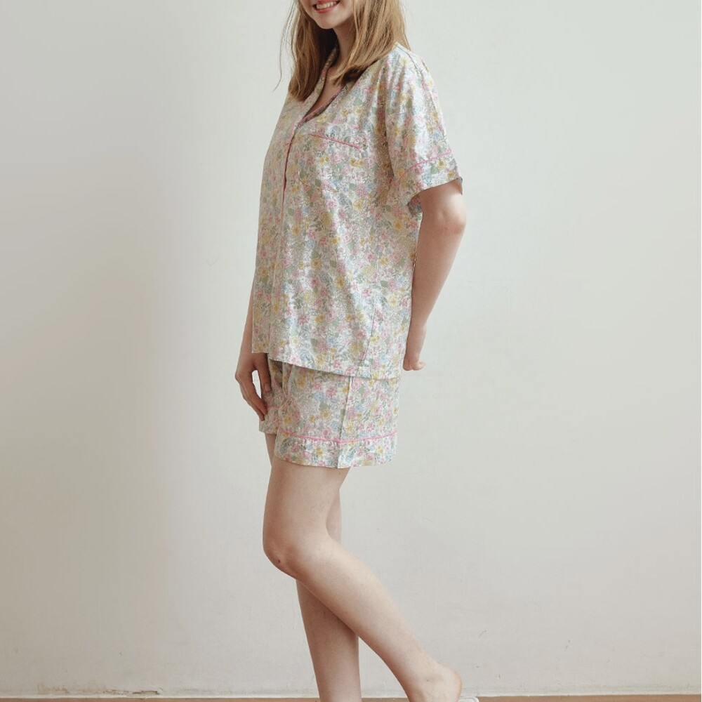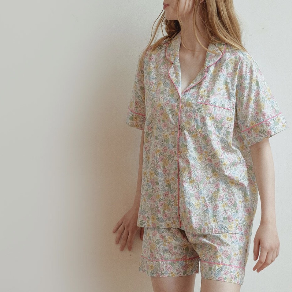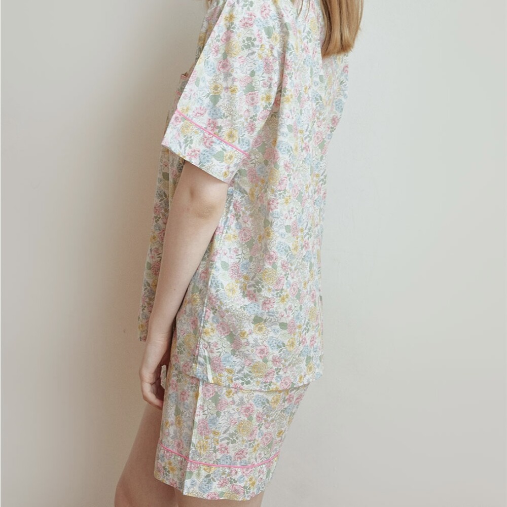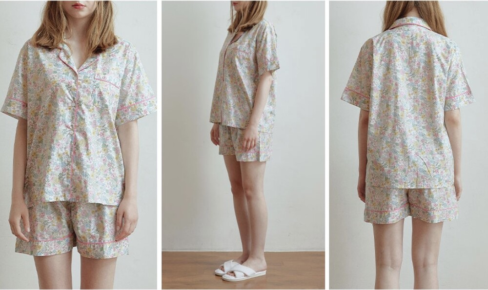 플로럴 모티브로 러블리하고 통통튀는 매력을 가진 파자마 세트입니다.