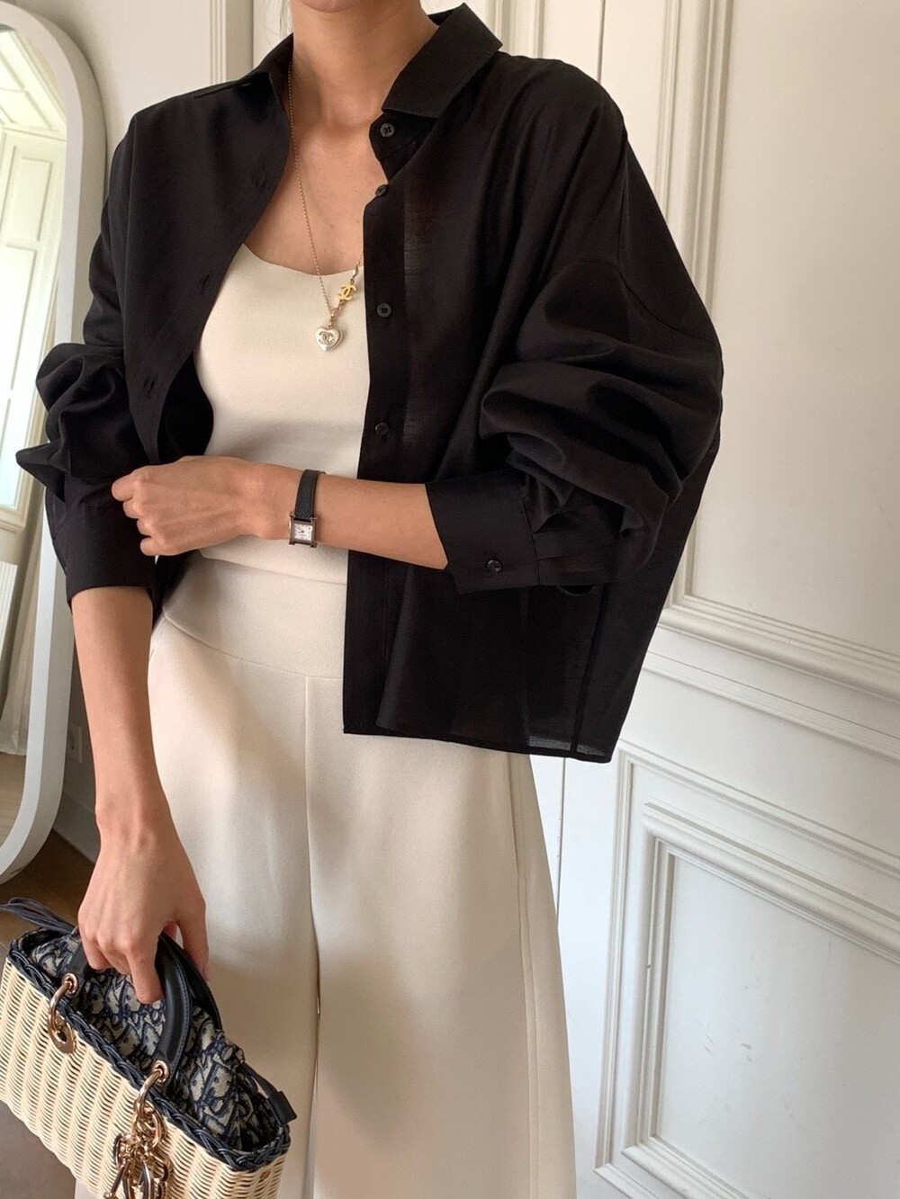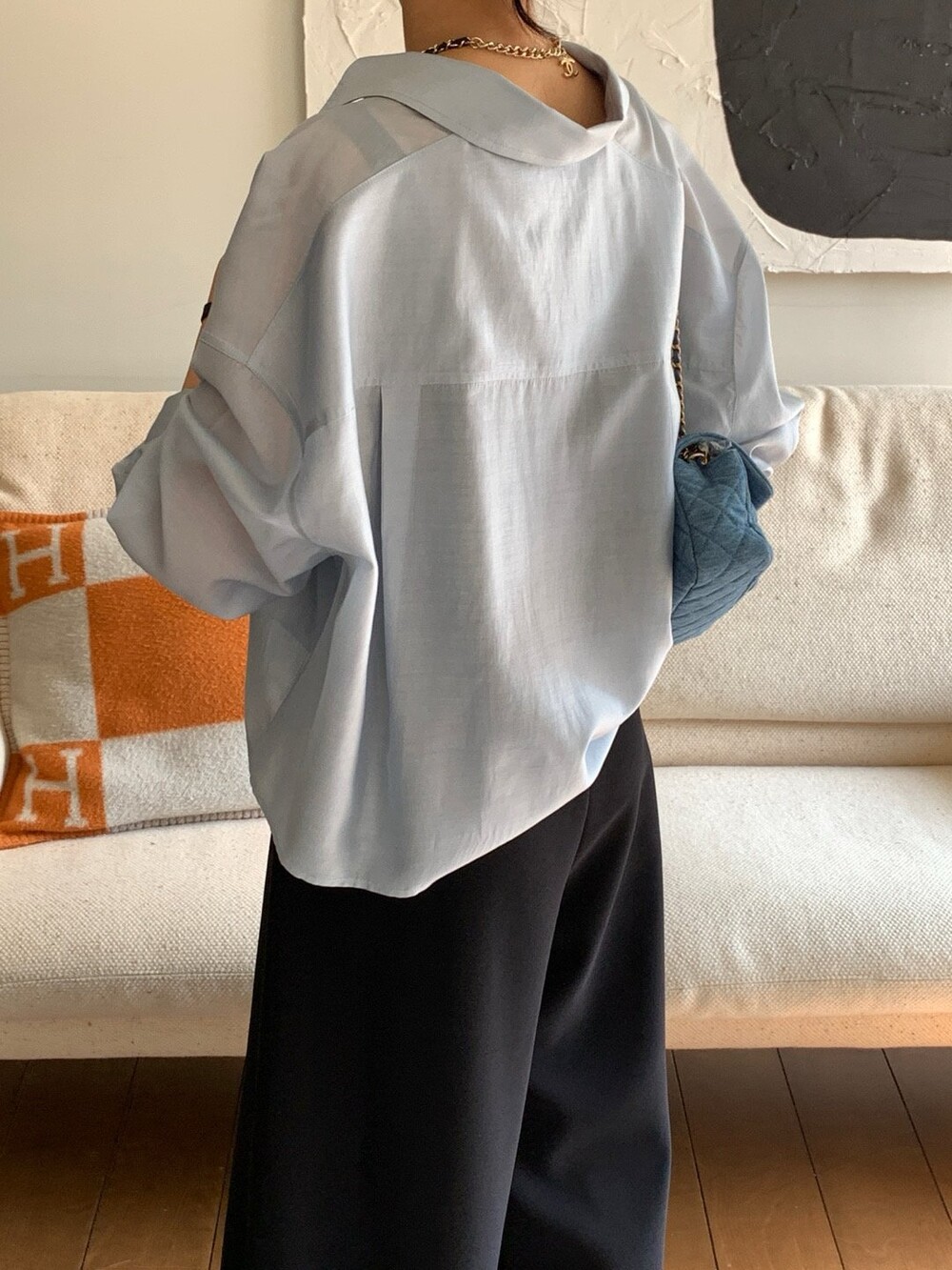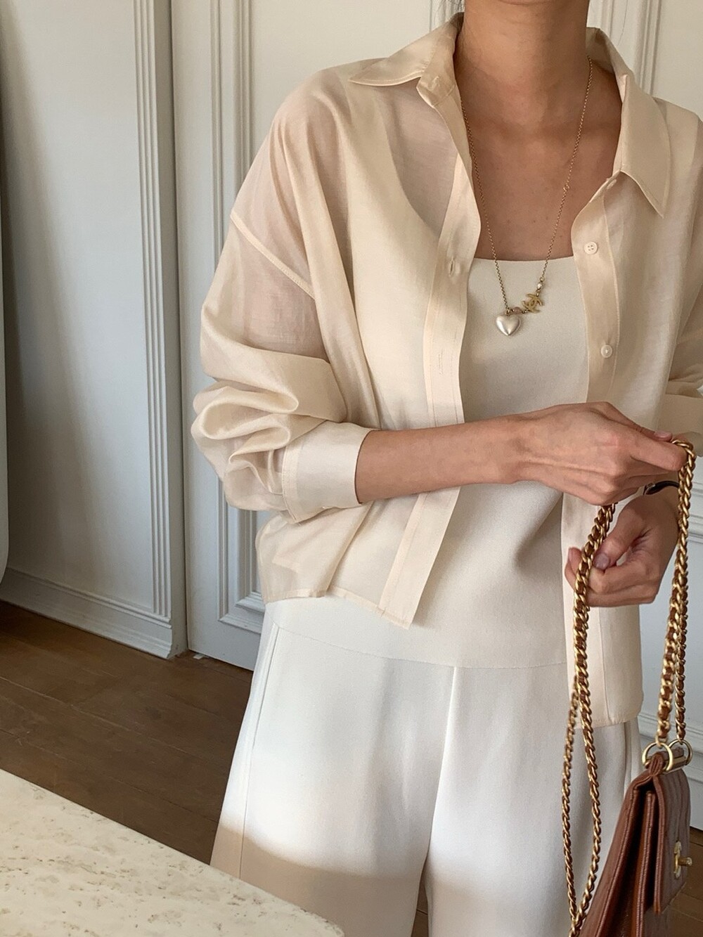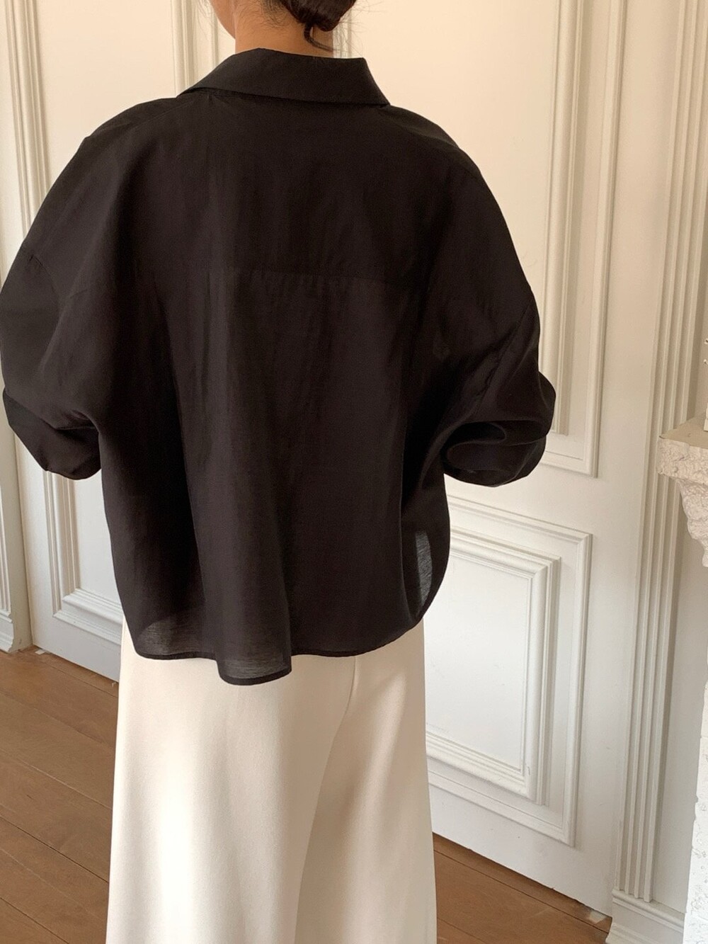 은은한 광택이 느껴지는 오간자 느낌의 블라우스로 비침도 적당해서 단품으로 입어도 포인트가 될만큼 멋진 디자인이며 여름엔 슬리브리스와 함께 걸쳐도 아우터 대용으로 충분히 활용하실수 있을것 같습니다.