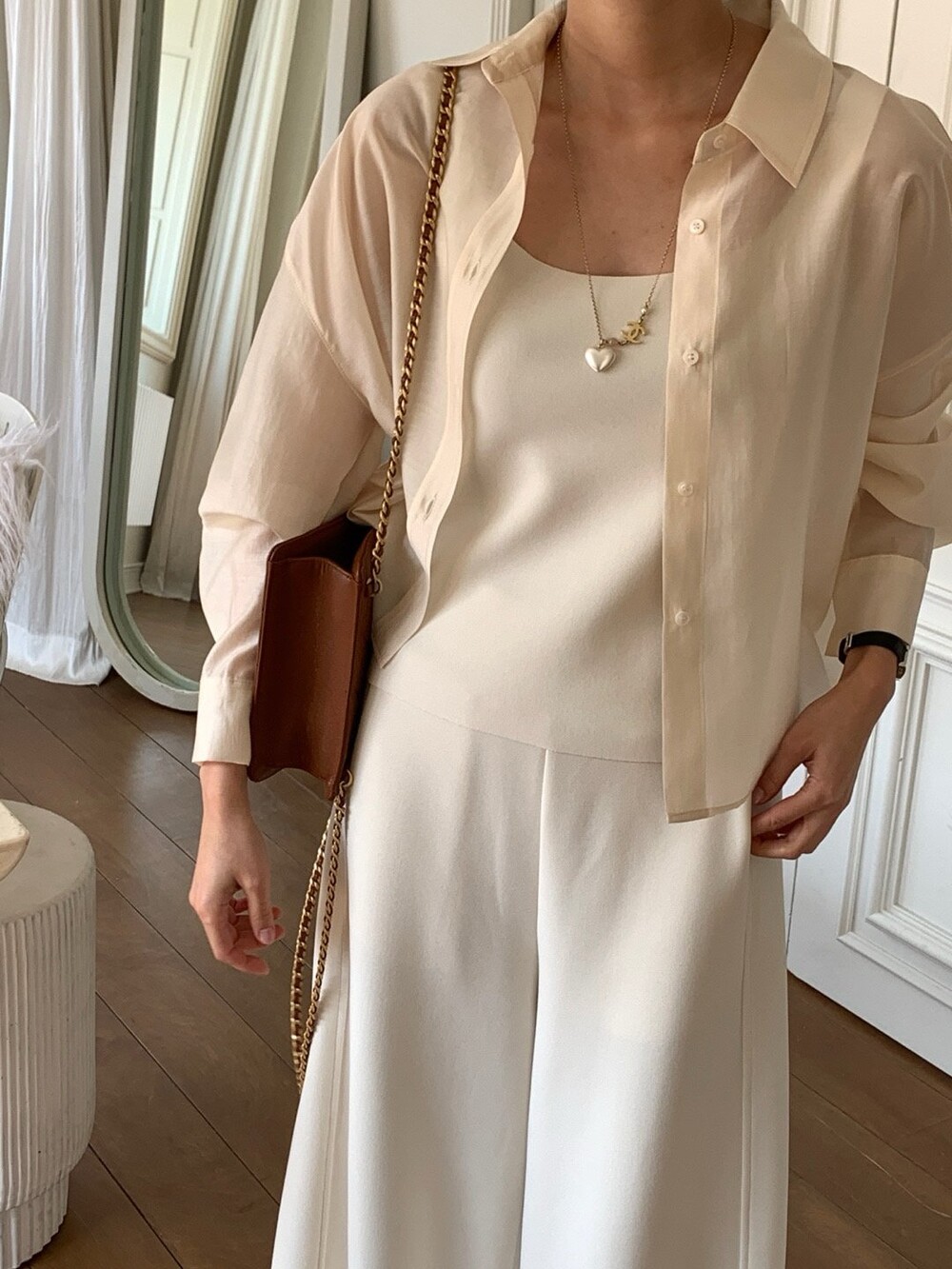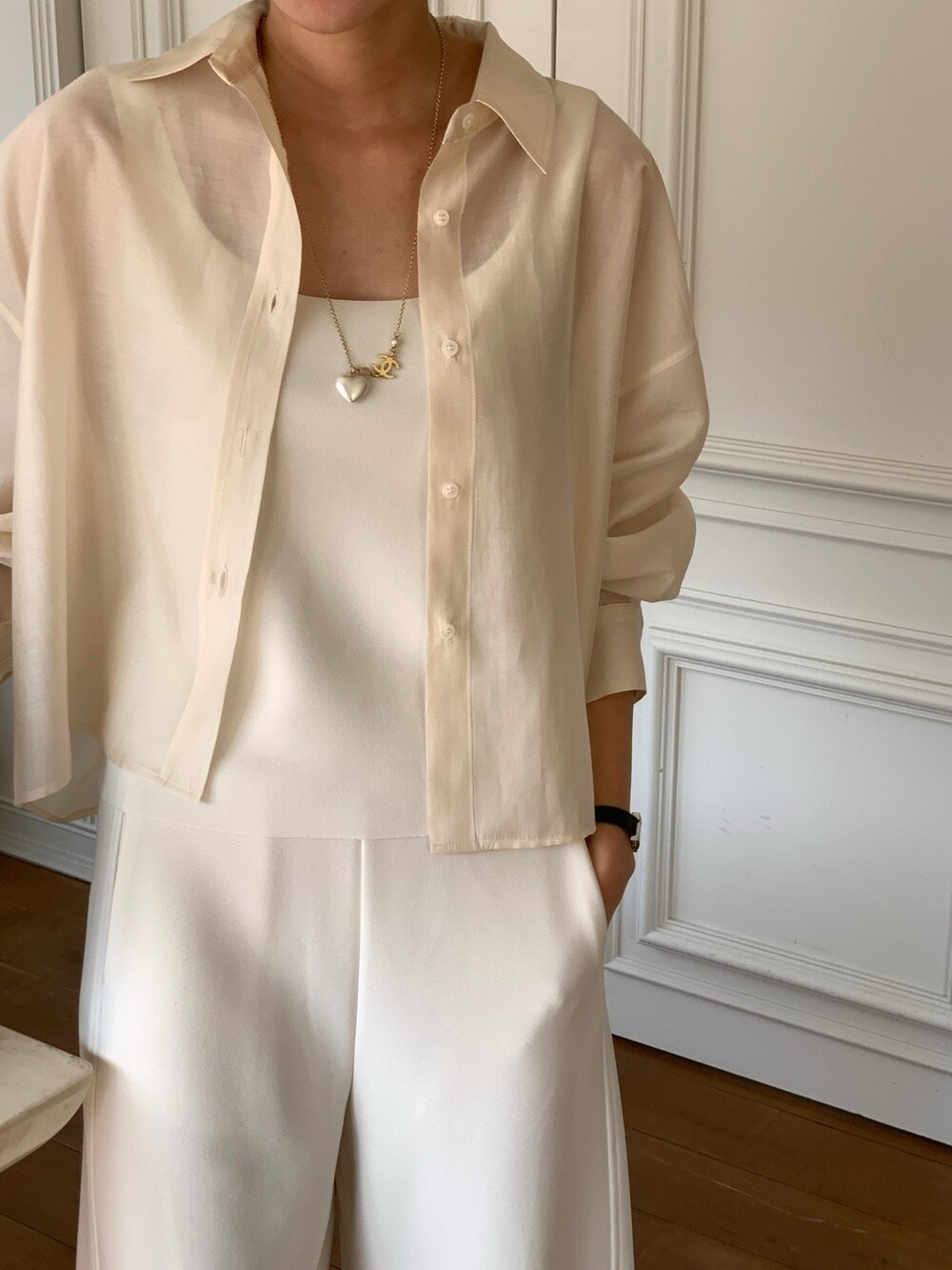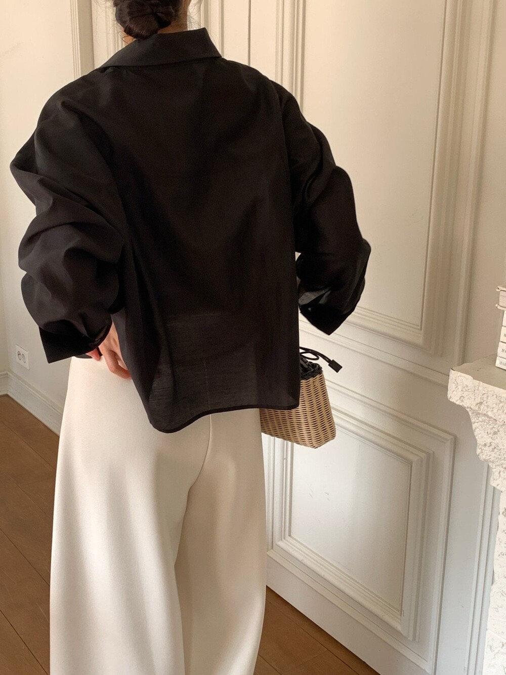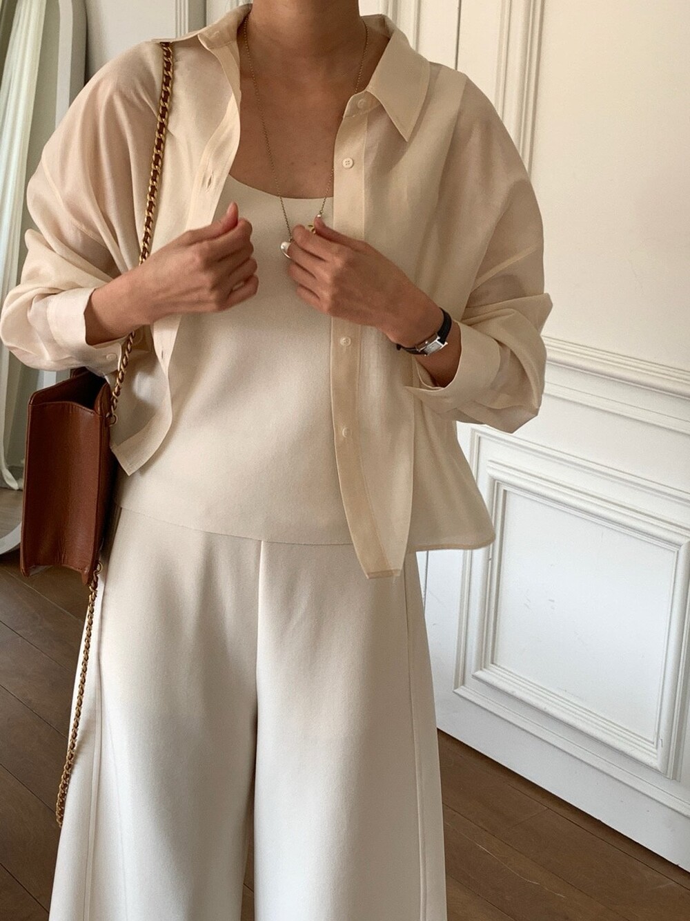 은은한 광택이 느껴지는 오간자 느낌의 블라우스로 비침도 적당해서 단품으로 입어도 포인트가 될만큼 멋진 디자인이며 여름엔 슬리브리스와 함께 걸쳐도 아우터 대용으로 충분히 활용하실수 있을것 같습니다.